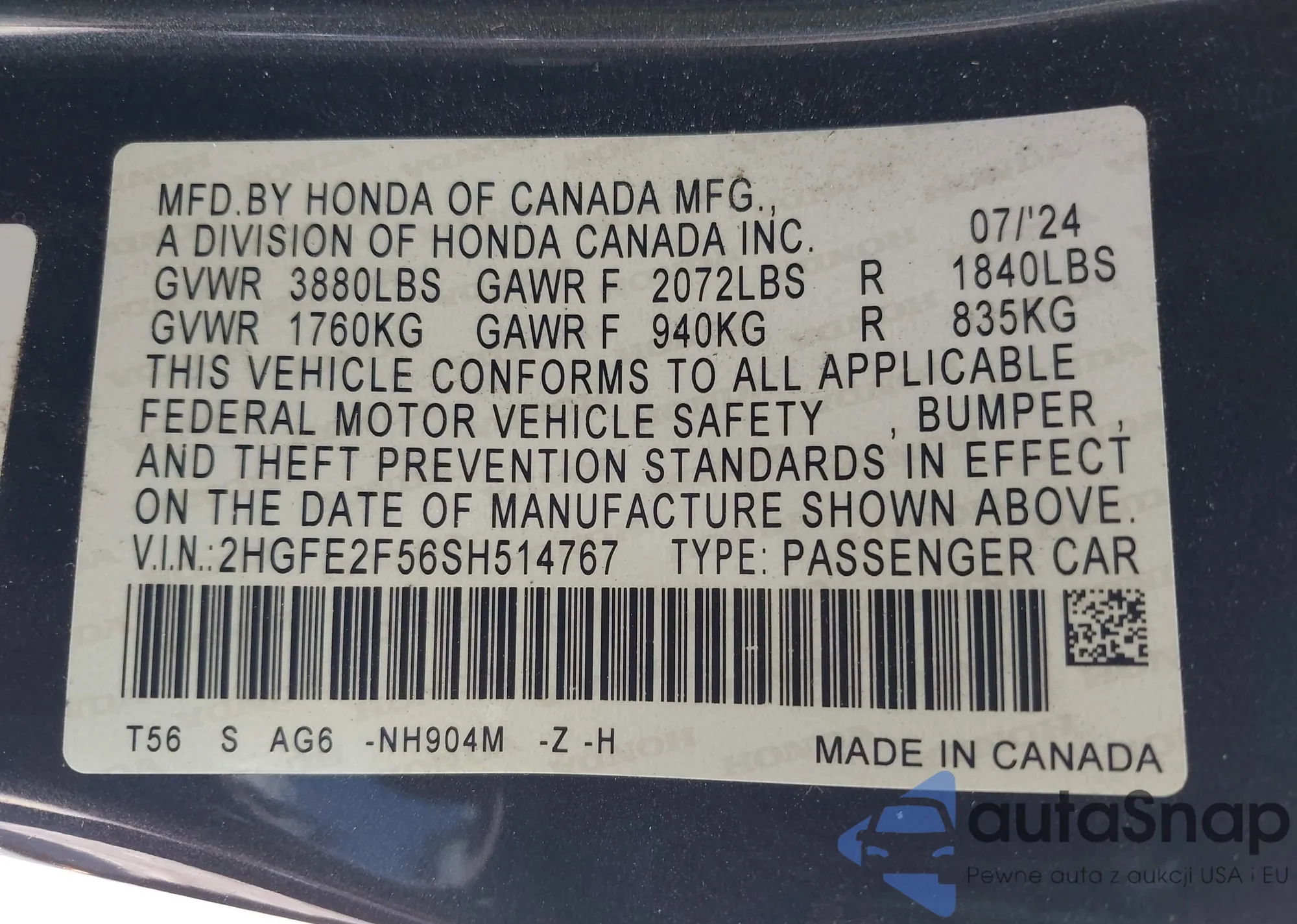 LOT: 42864555 VIN: 2HGFE2F56SH514767