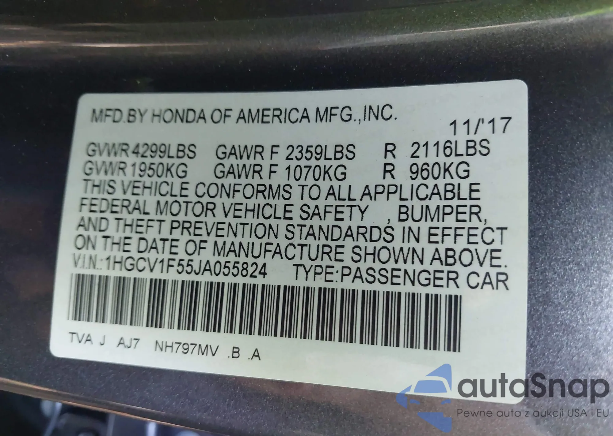 LOT: 42792899 VIN: 1HGCV1F55JA055824
