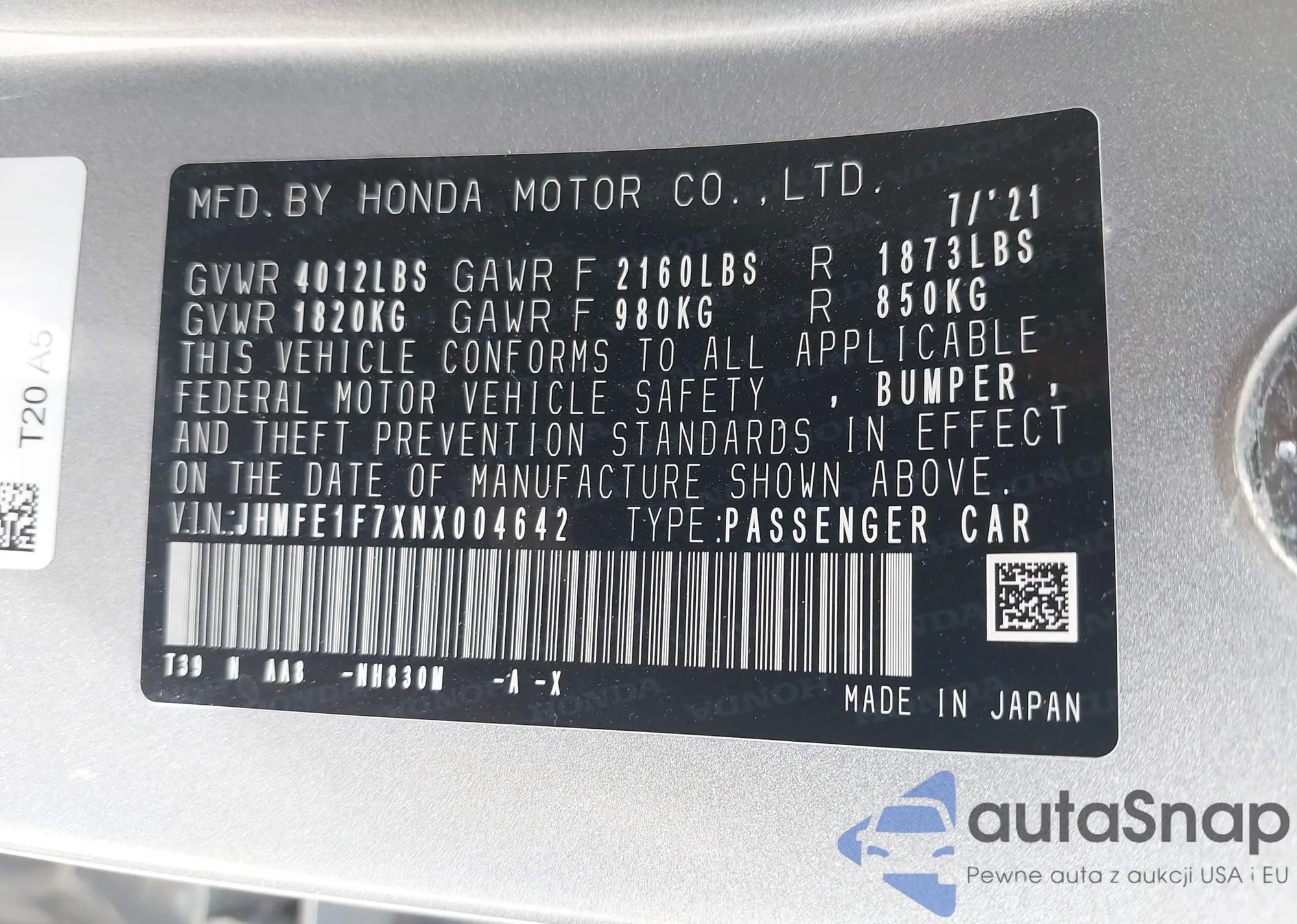 LOT: 42796532 VIN: JHMFE1F7XNX004642