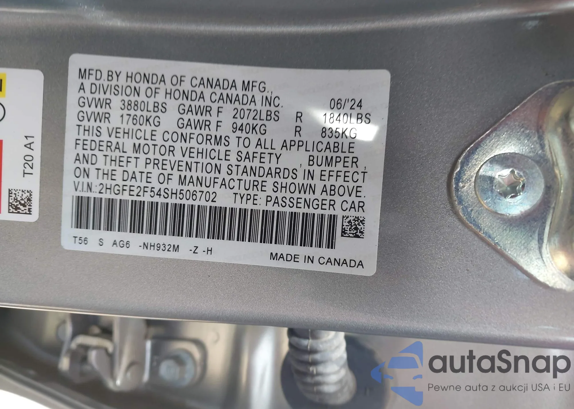 • VIN 2HGFE2F54SH506702
