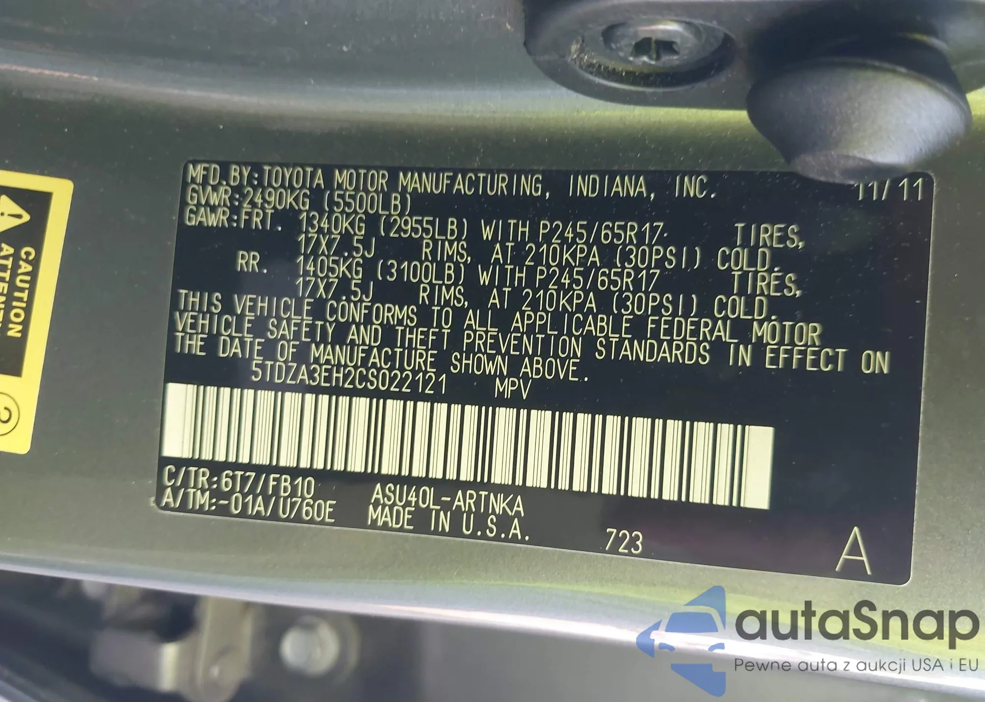 • VIN 5TDZA3EH2CS022121