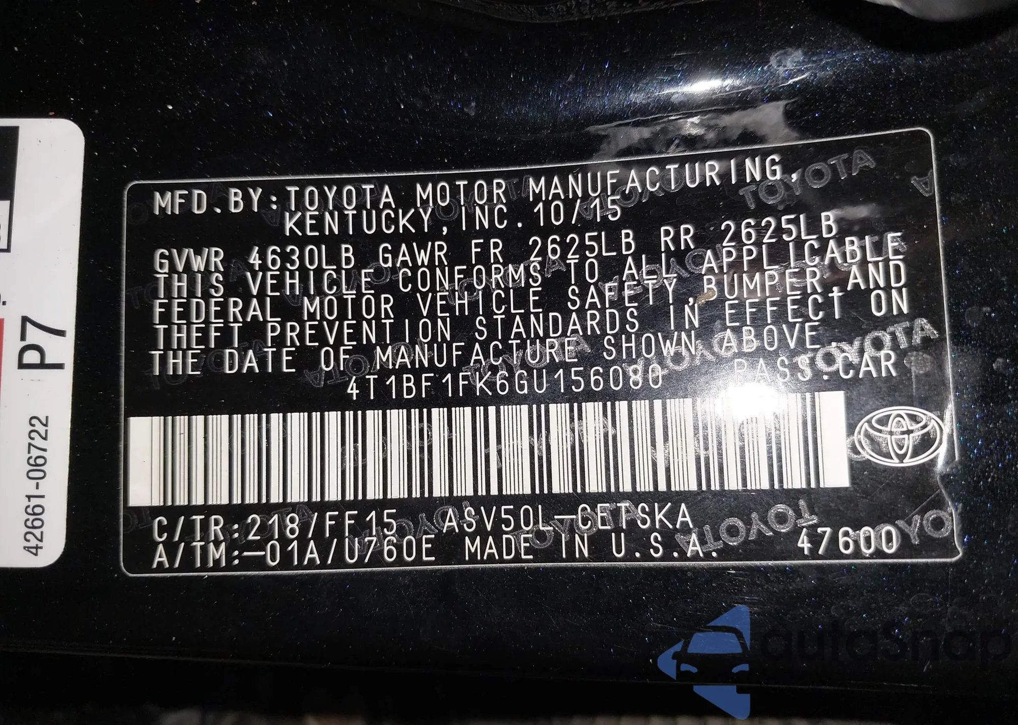 • VIN 4T1BF1FK6GU156080
