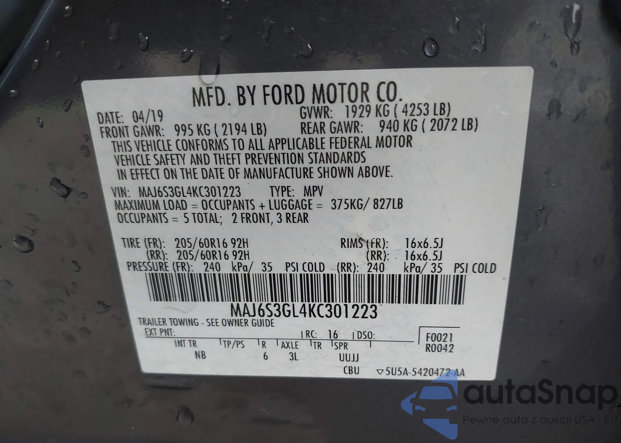 • VIN MAJ6S3GL4KC301223