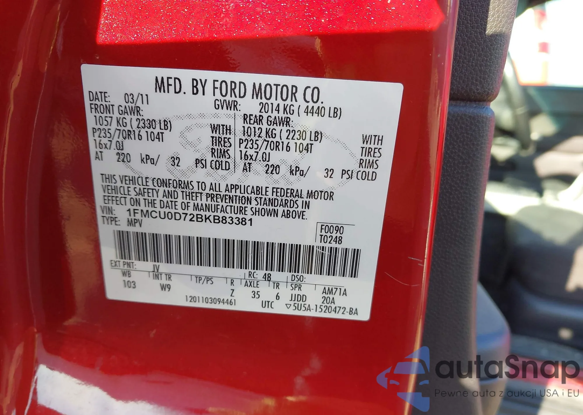 • VIN 1FMCU0D72BKB83381