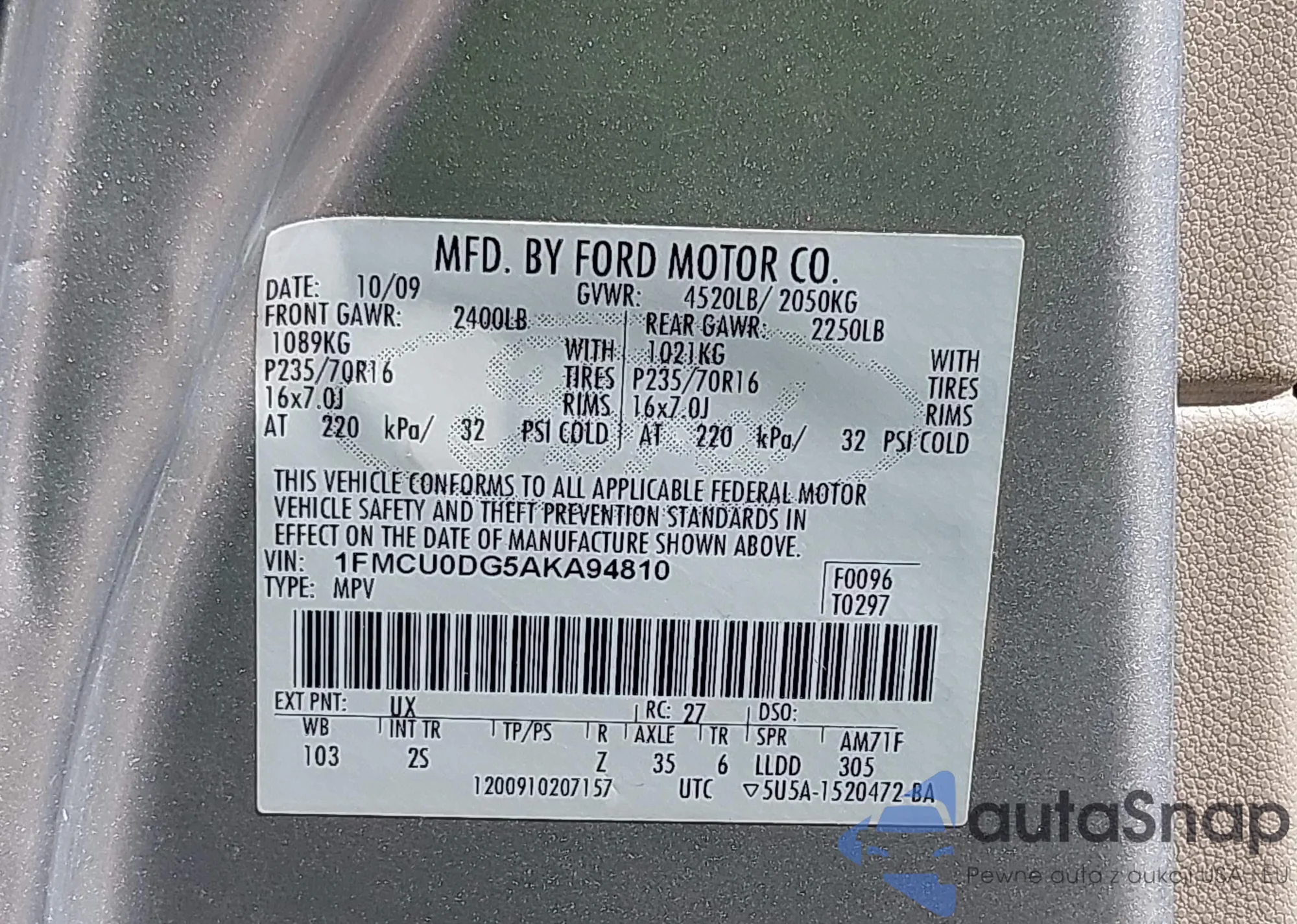 • VIN 1FMCU0DG5AKA94810