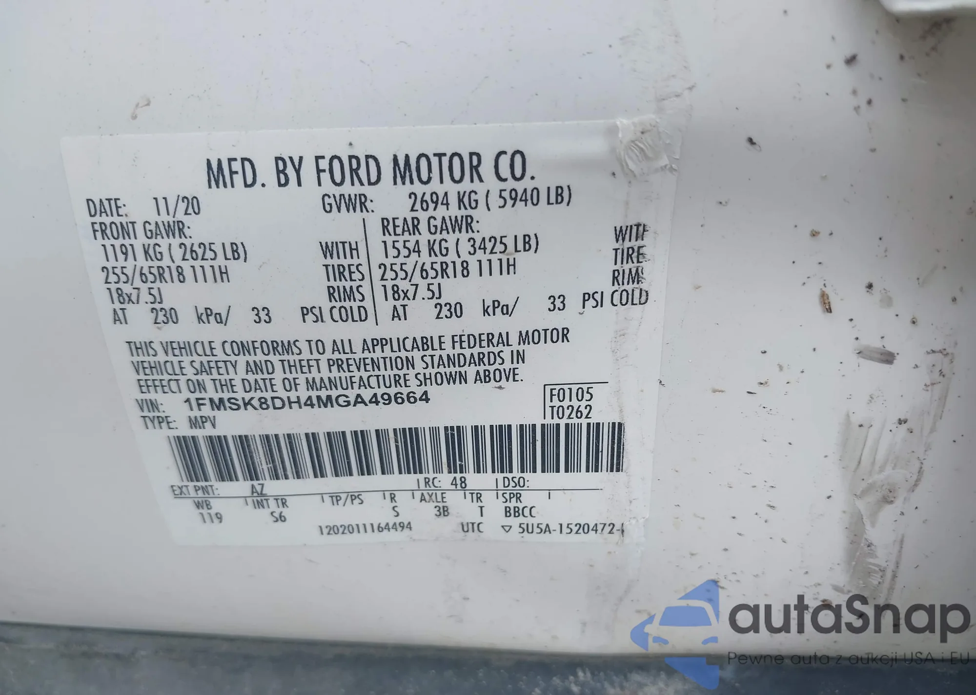 • VIN 1FMSK8DH4MGA49664