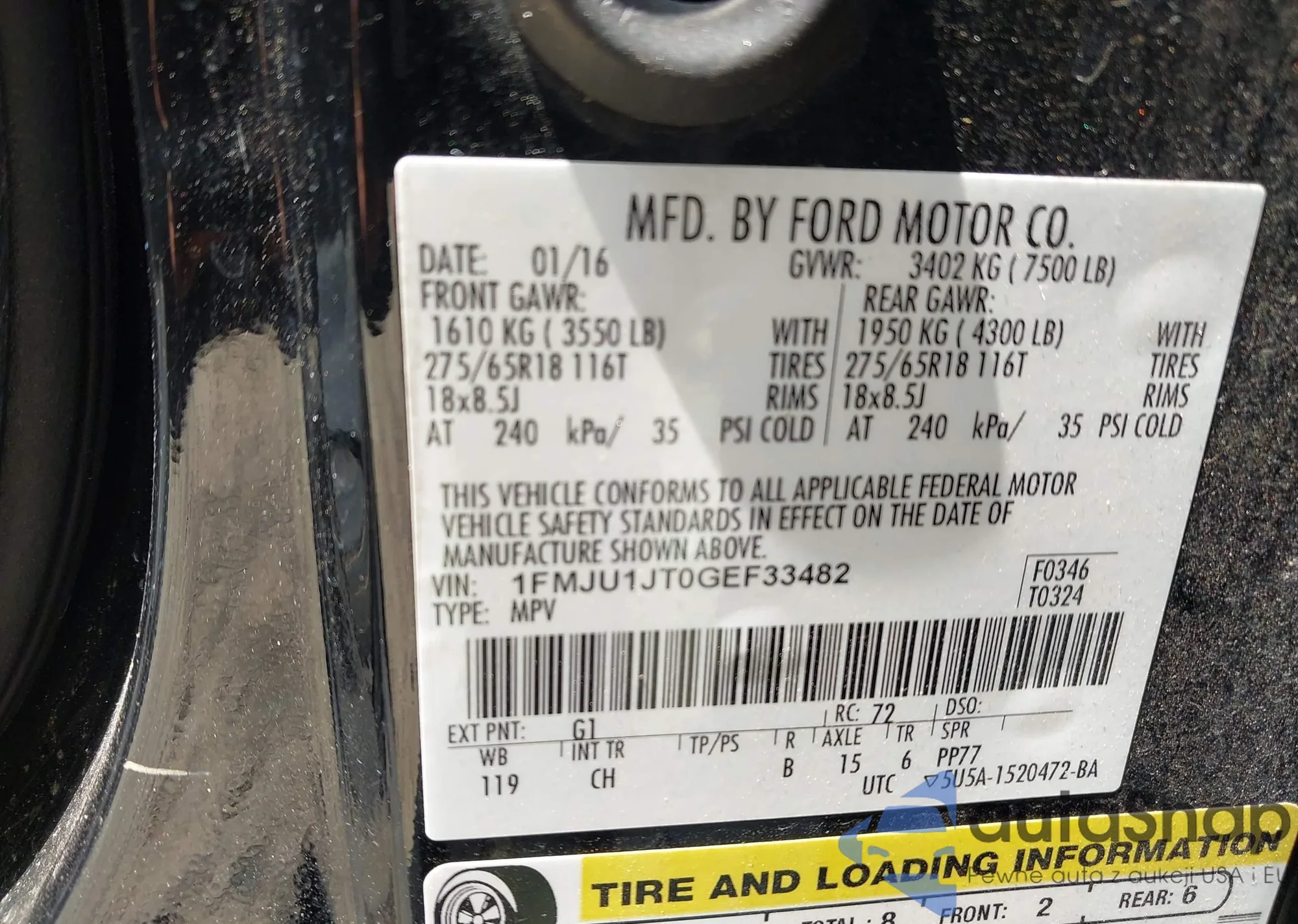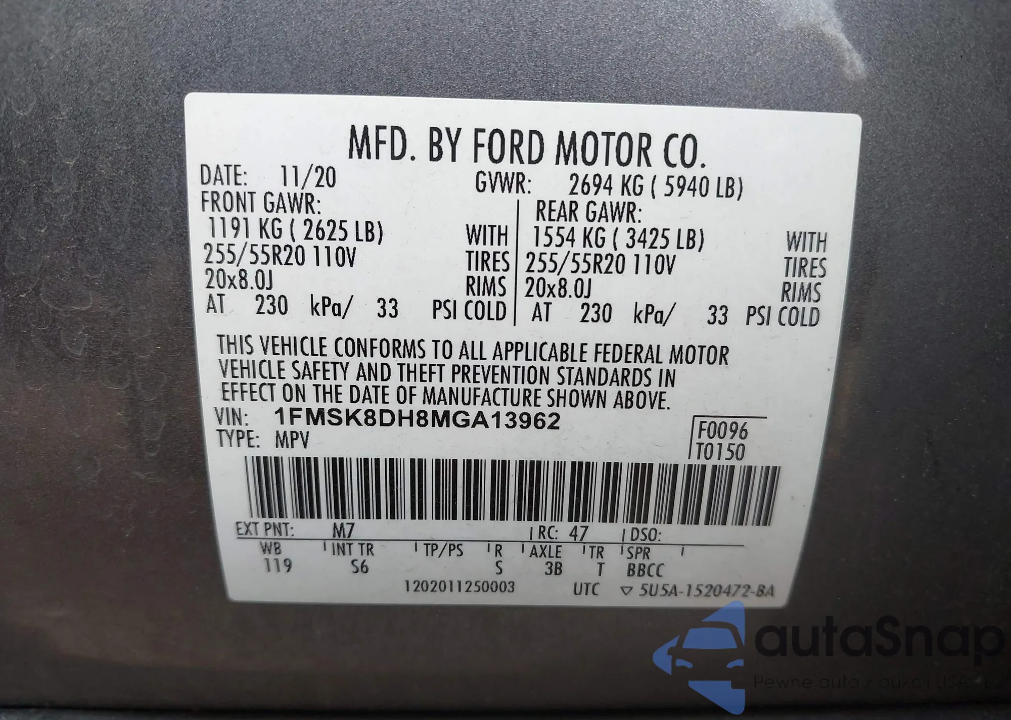 LOT: 42730178 VIN: 1FMSK8DH8MGA13962
