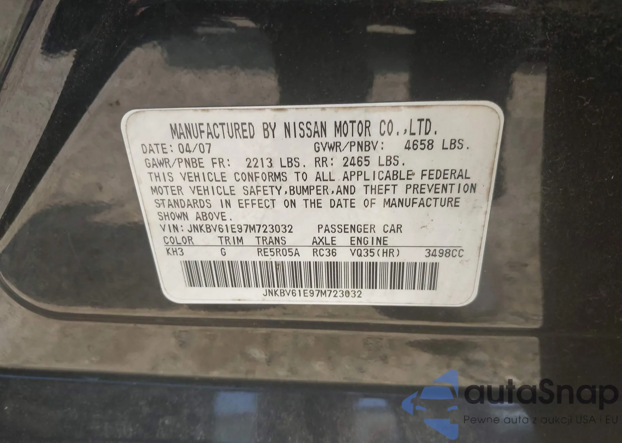 2007 Infiniti G35 Journey from USA, damaged, VIN JNKBV61E97M723032
