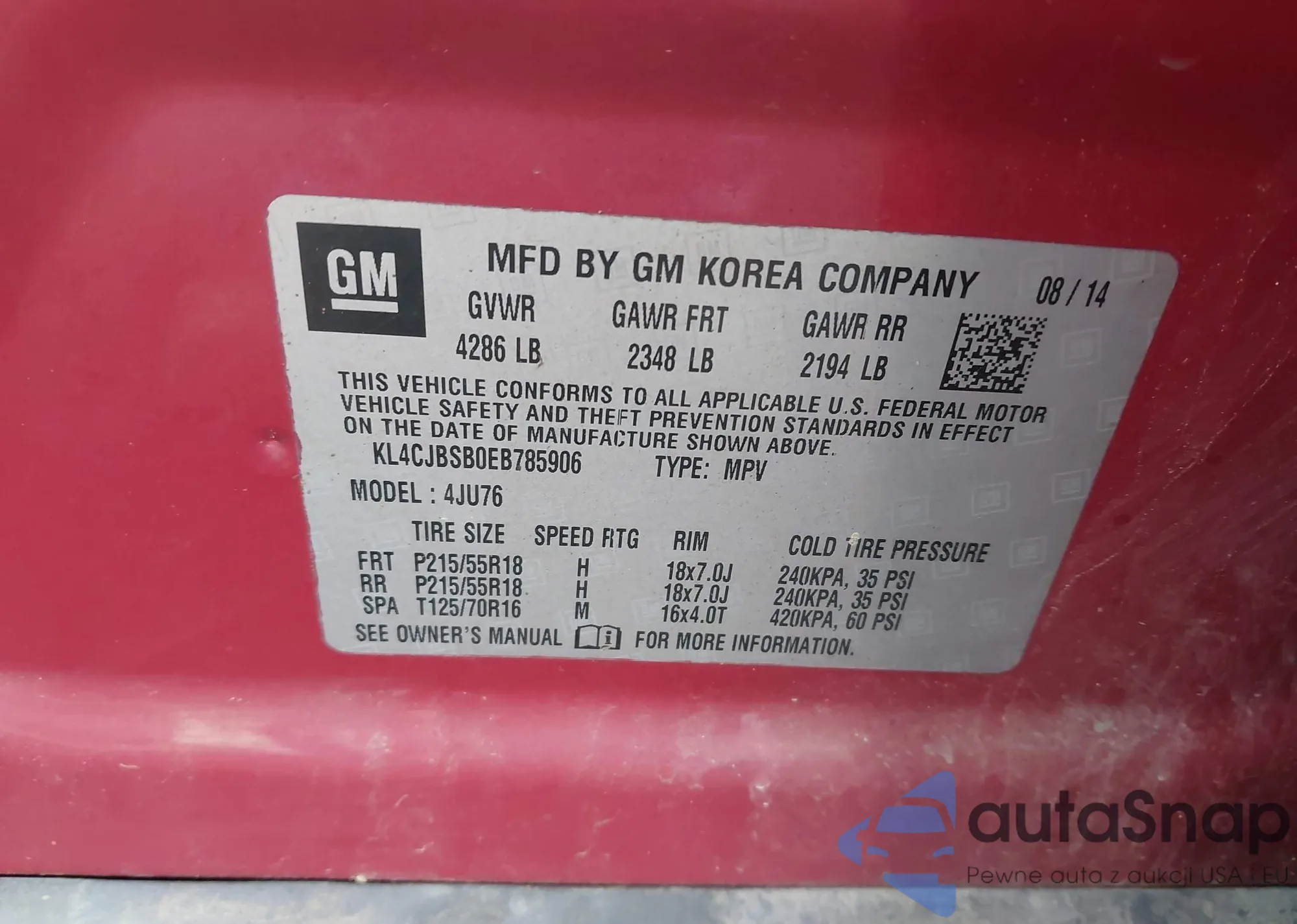 • VIN KL4CJBSB0EB785906