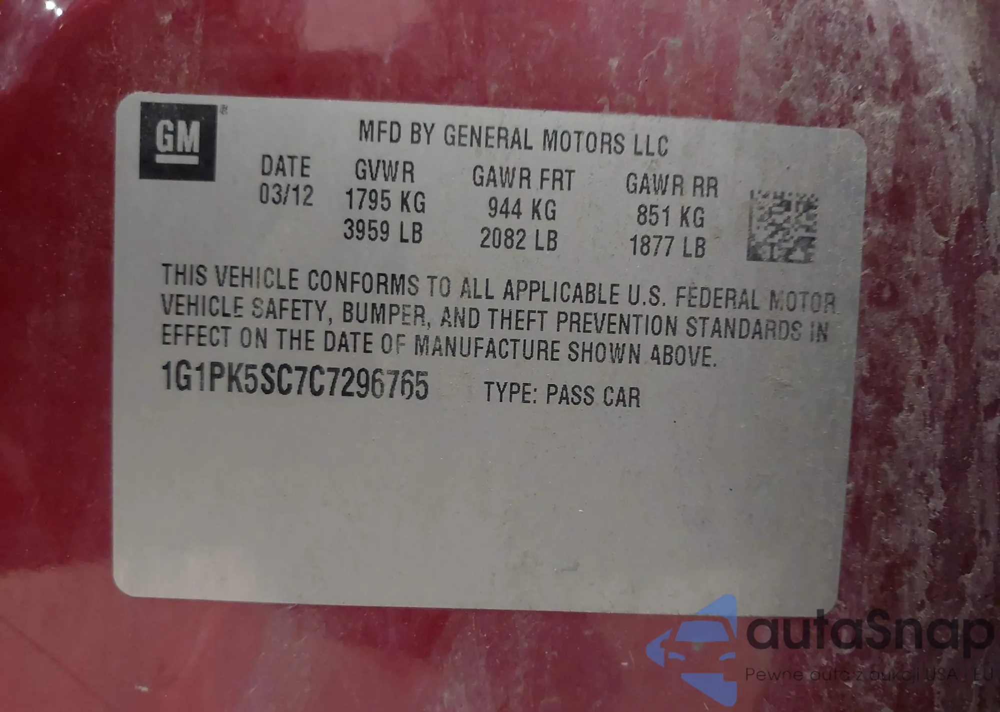 LOT: 42498050 VIN: 1G1PK5SC7C7296765