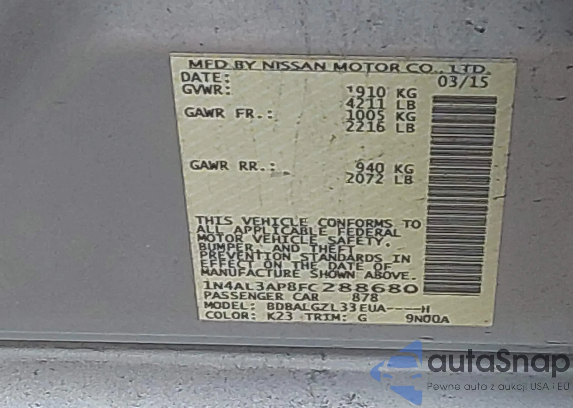 LOT: 42731298 VIN: 1N4AL3AP8FC288680