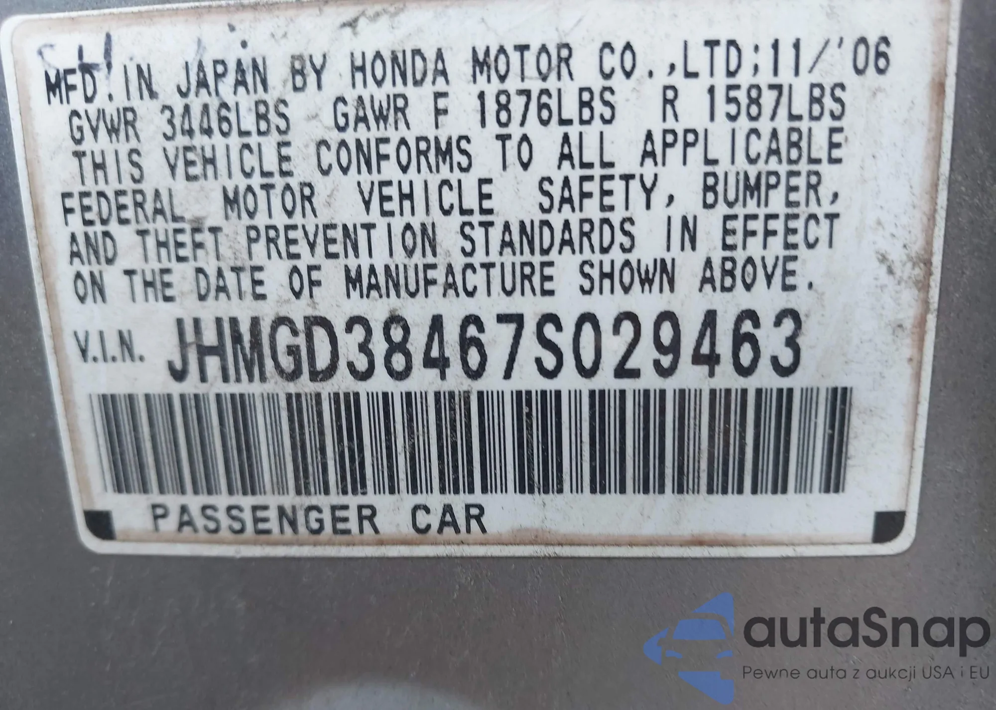 • VIN 2HKYF18137H507184