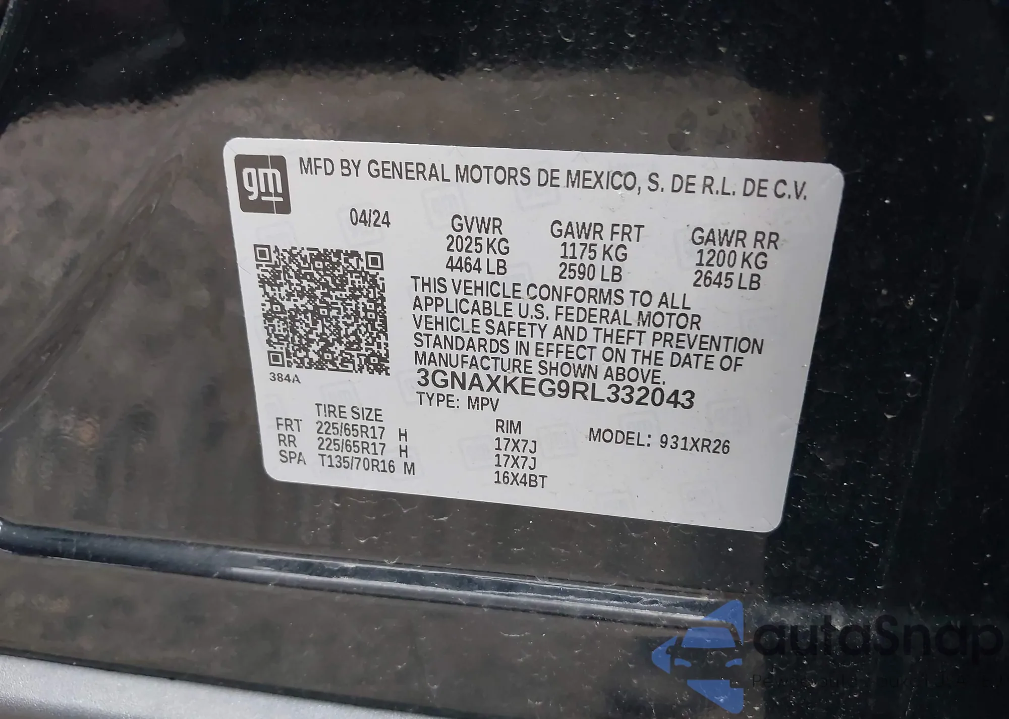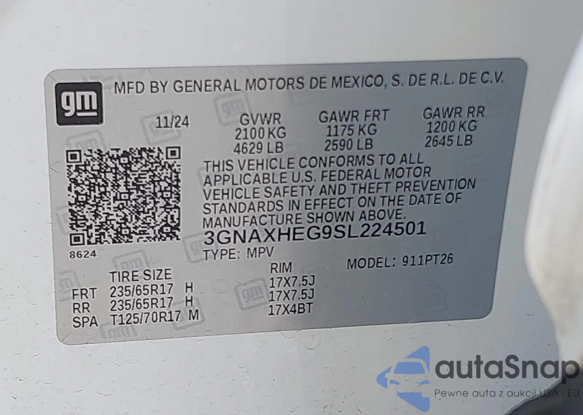 • VIN 3GNAXHEG9SL224501