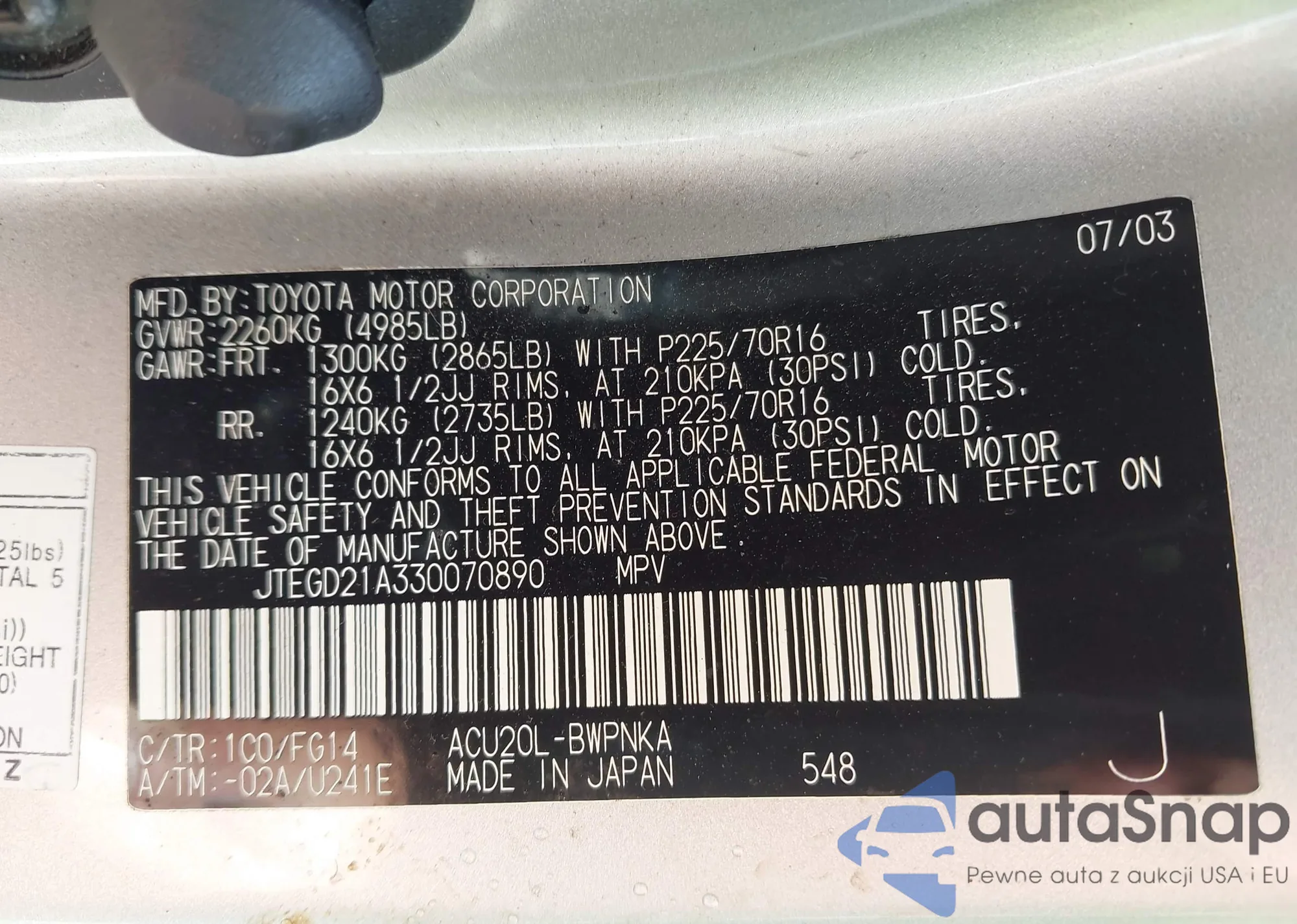 LOT: 42388327 VIN: JTEGD21A330070890