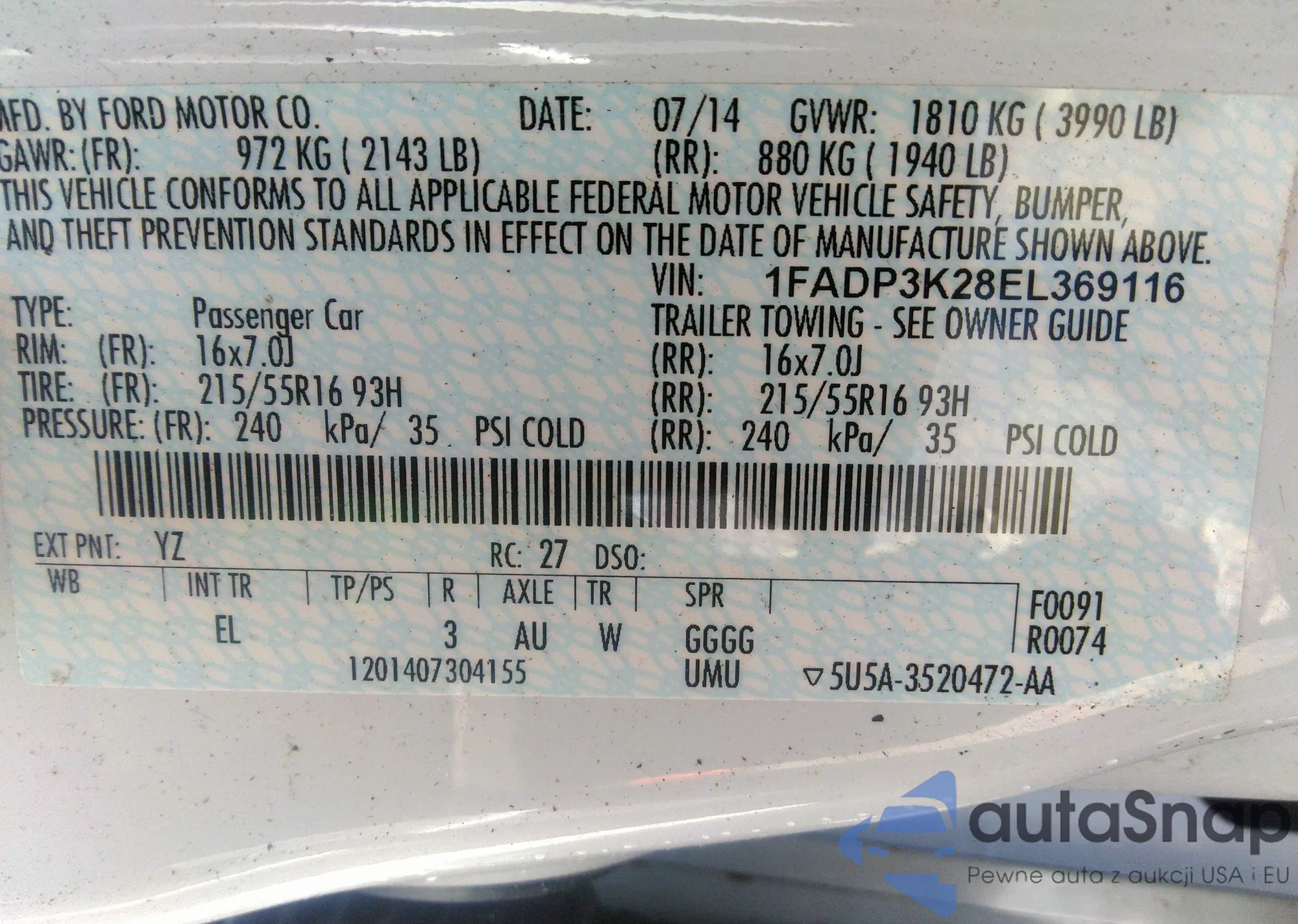 LOT: 42546279 VIN: 1FADP3K28EL369116