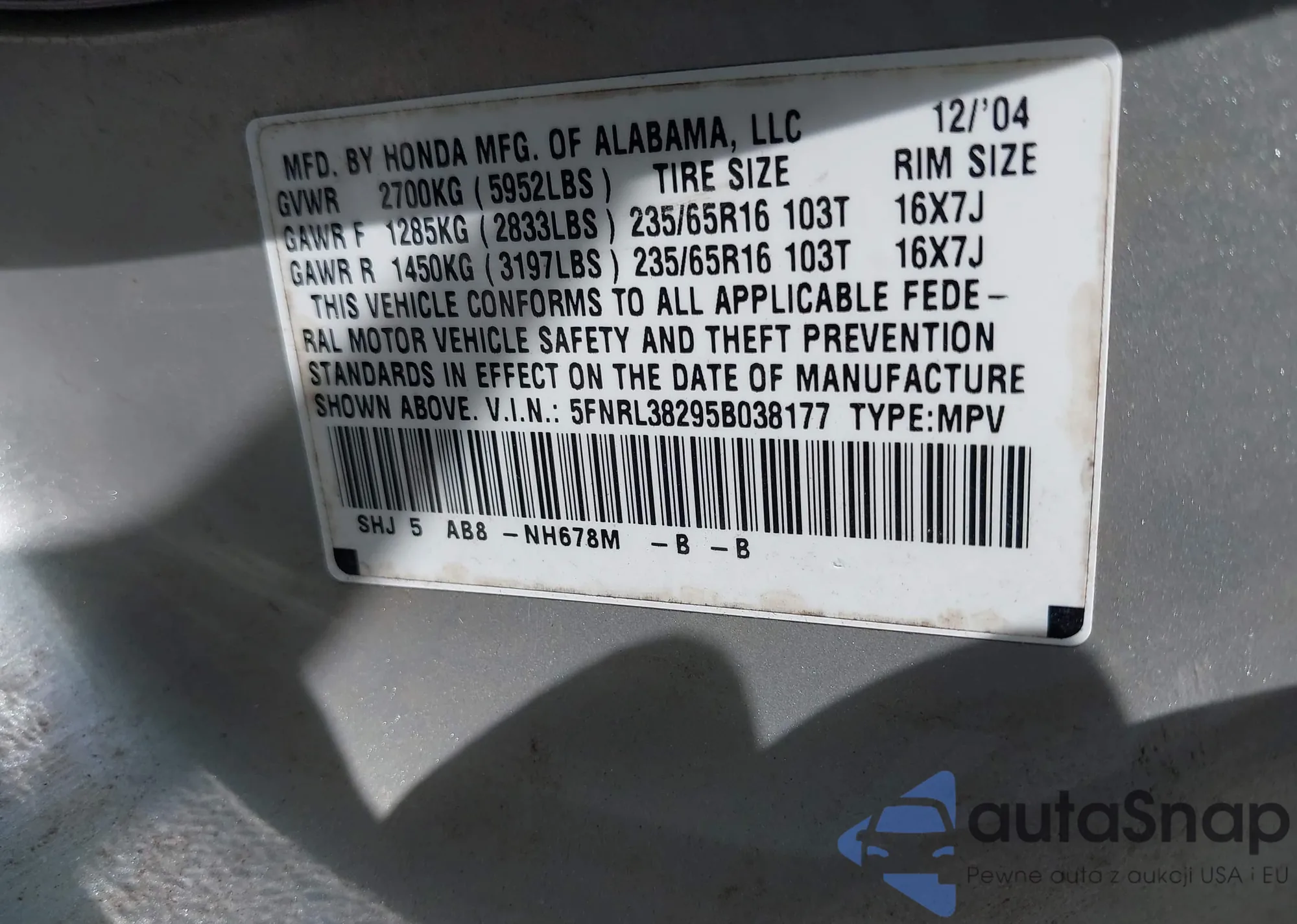 LOT: 42618657 VIN: 5FNRL38295B038177