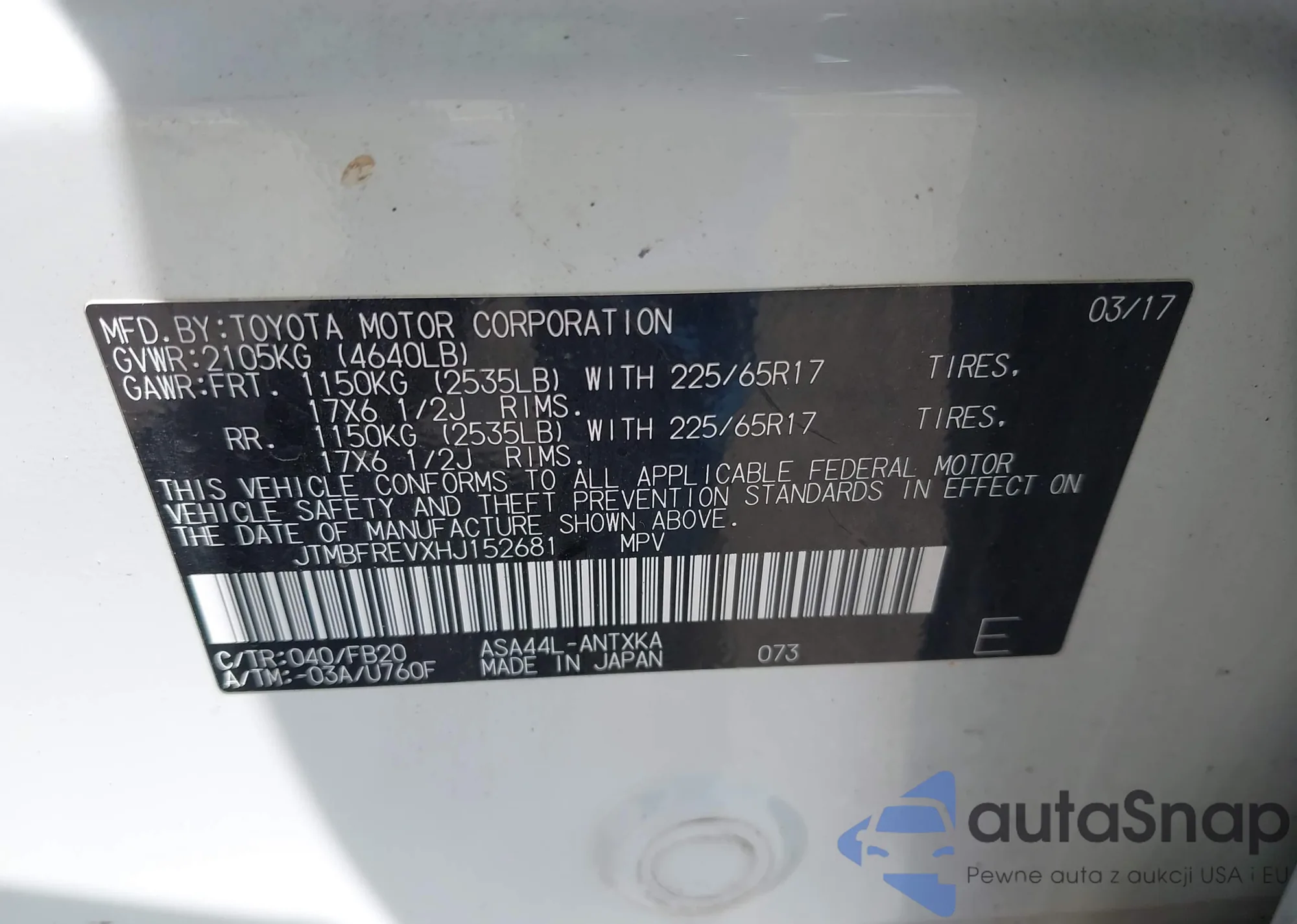 LOT: 42366644 VIN: JTMBFREVXHJ152681