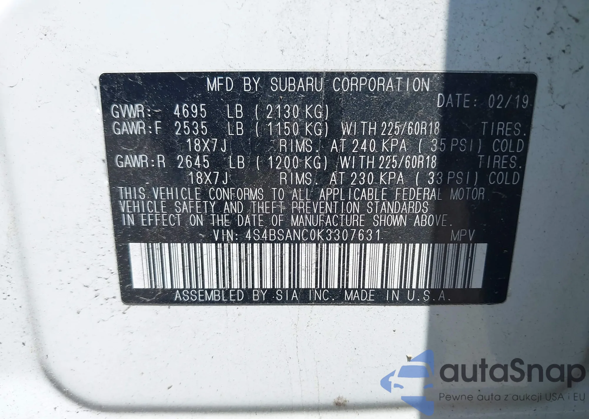 LOT: 42747519 VIN: 4S4BSANC0K3307631