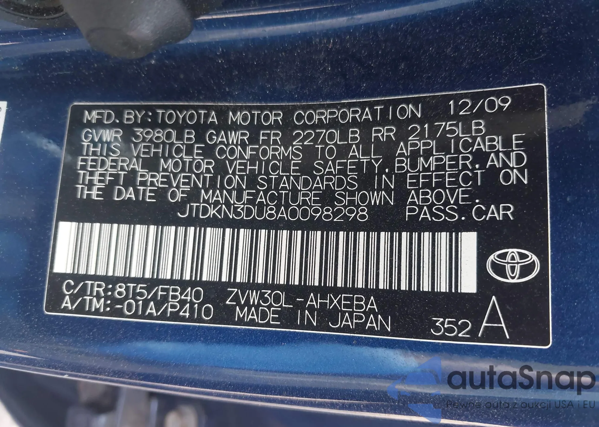 LOT: 42861599 VIN: JTDKN3DU8A0098298