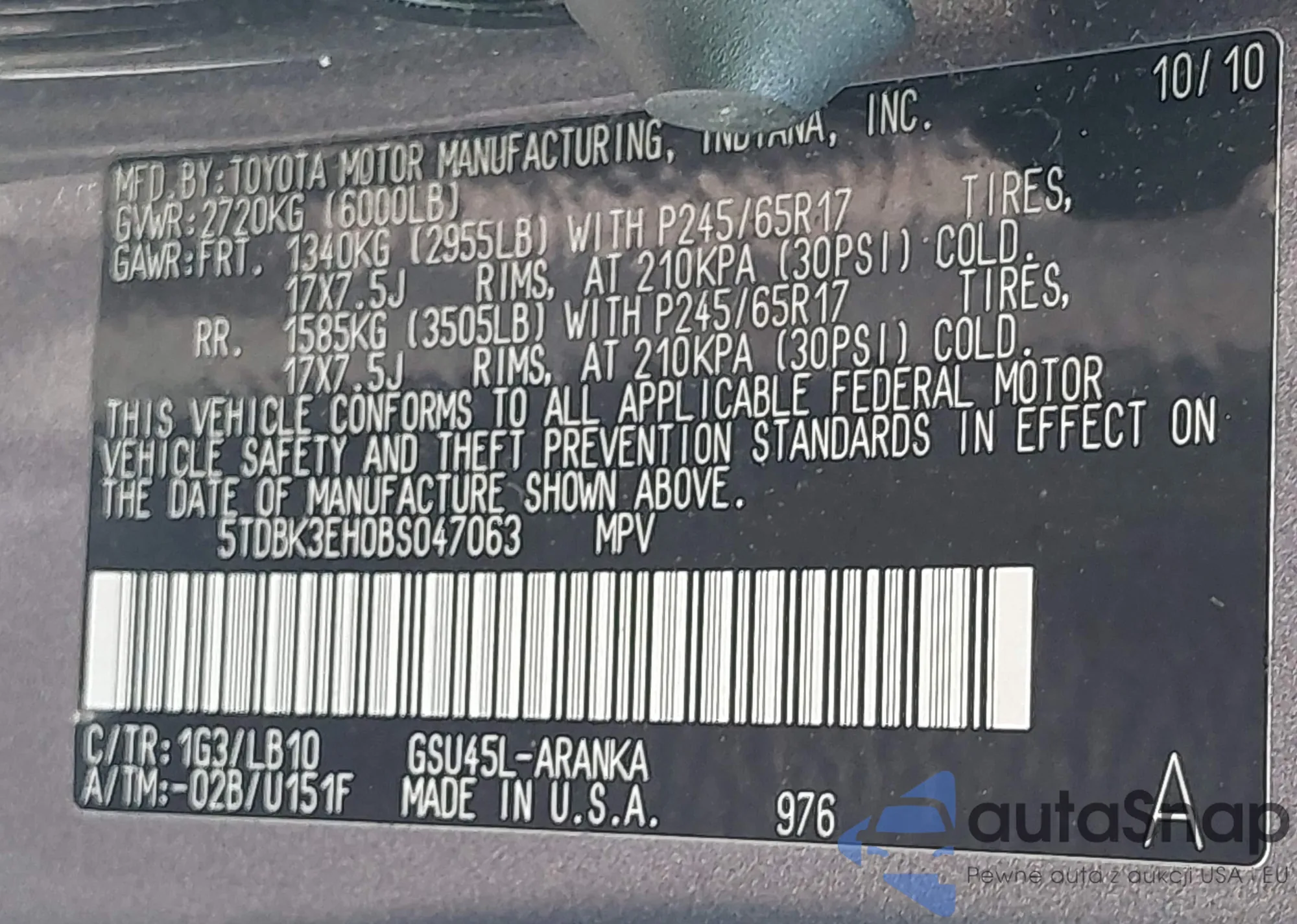 LOT: 42678755 VIN: 4T4BF3EK1AR063400