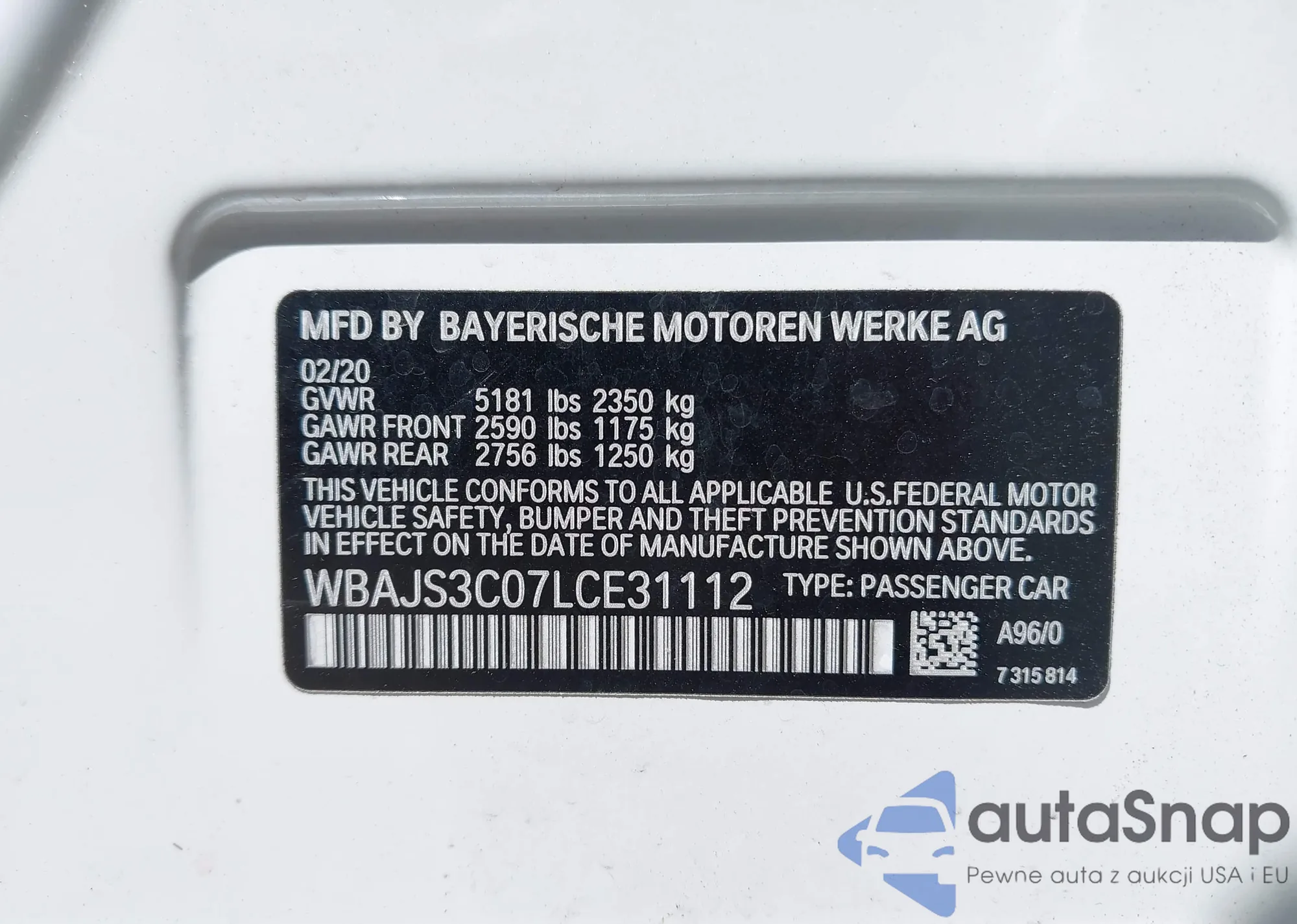 LOT: 42547409 VIN: WBAJS3C07LCE31112