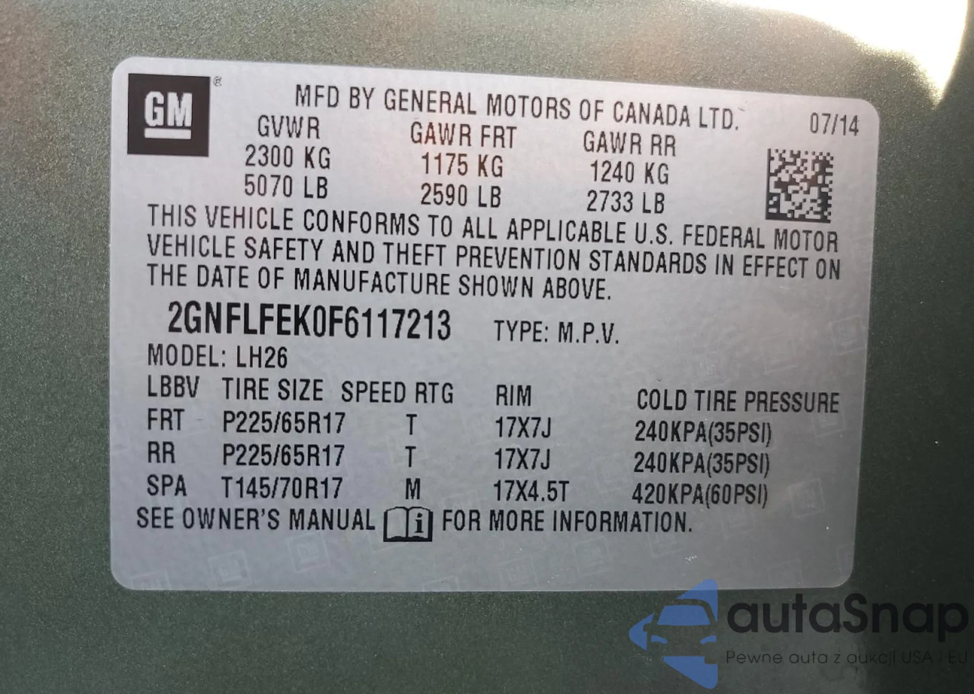 • VIN 2GNFLFEK0F6117213