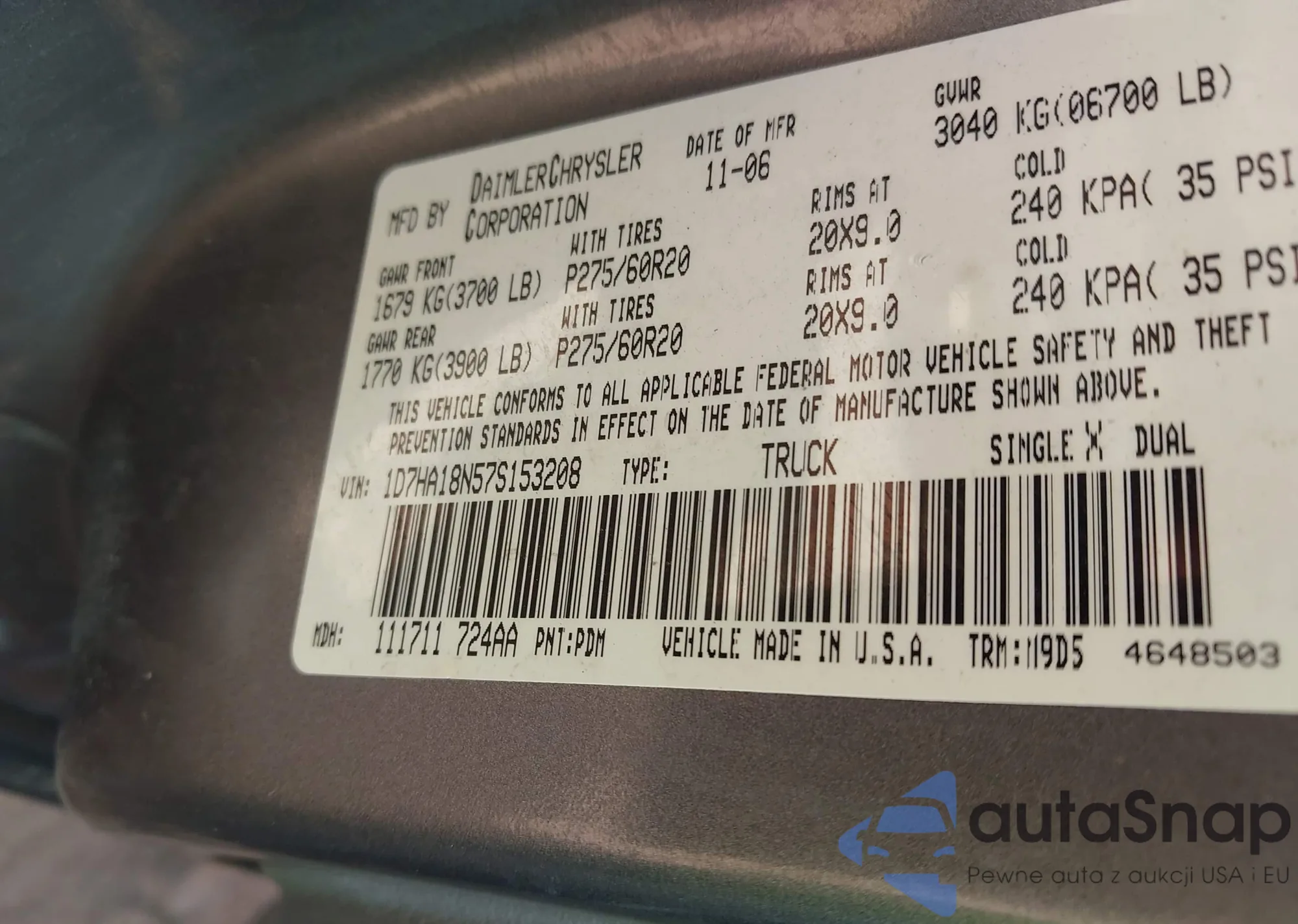 LOT: 42762862 VIN: 1D7HA18N57S153208