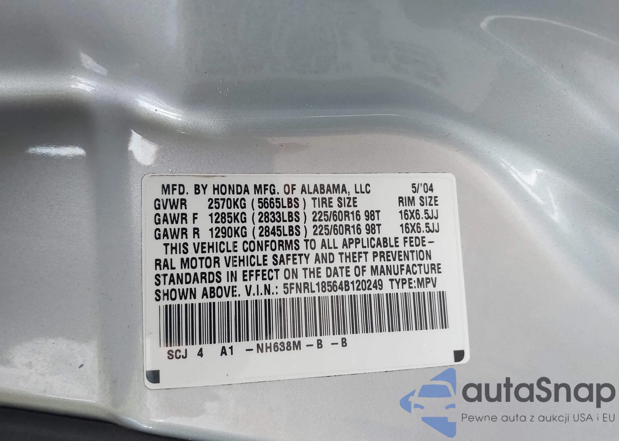 • VIN 5FNRL18564B120249