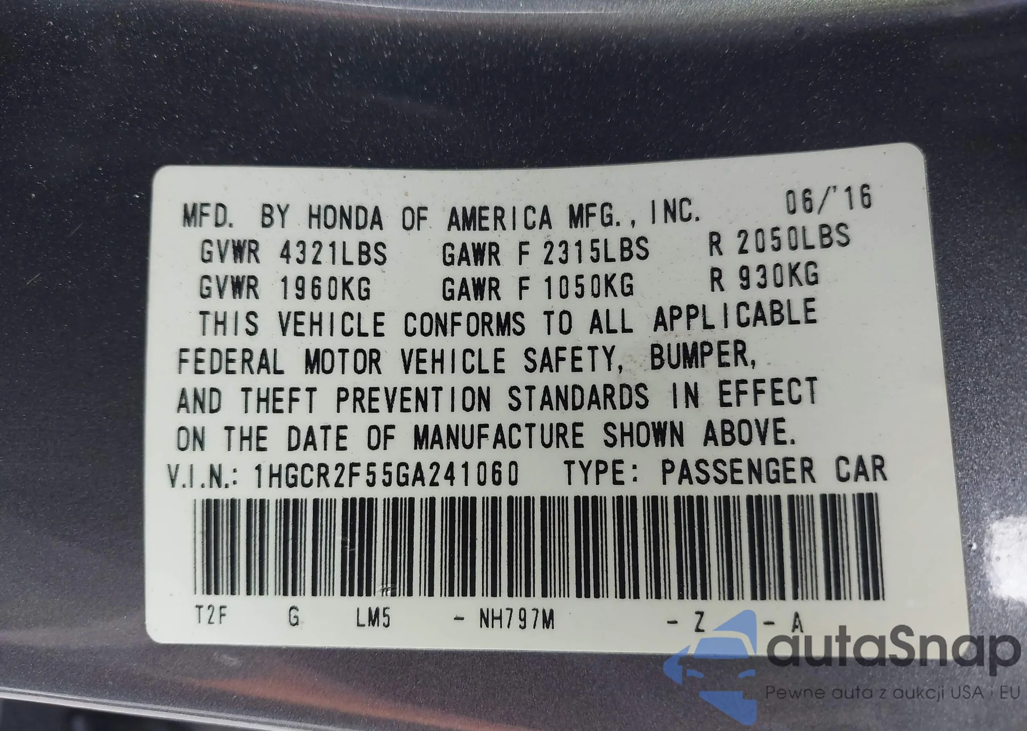 • VIN 1HGCR2F55GA241060
