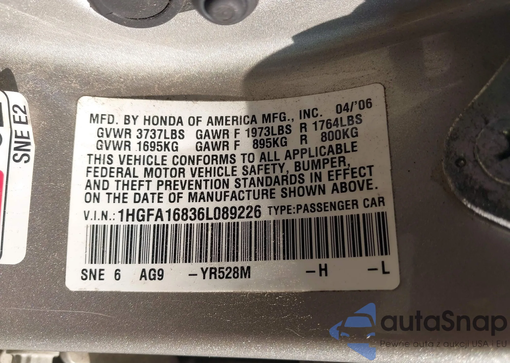 LOT: 42892333 VIN: 1HGFA16836L089226