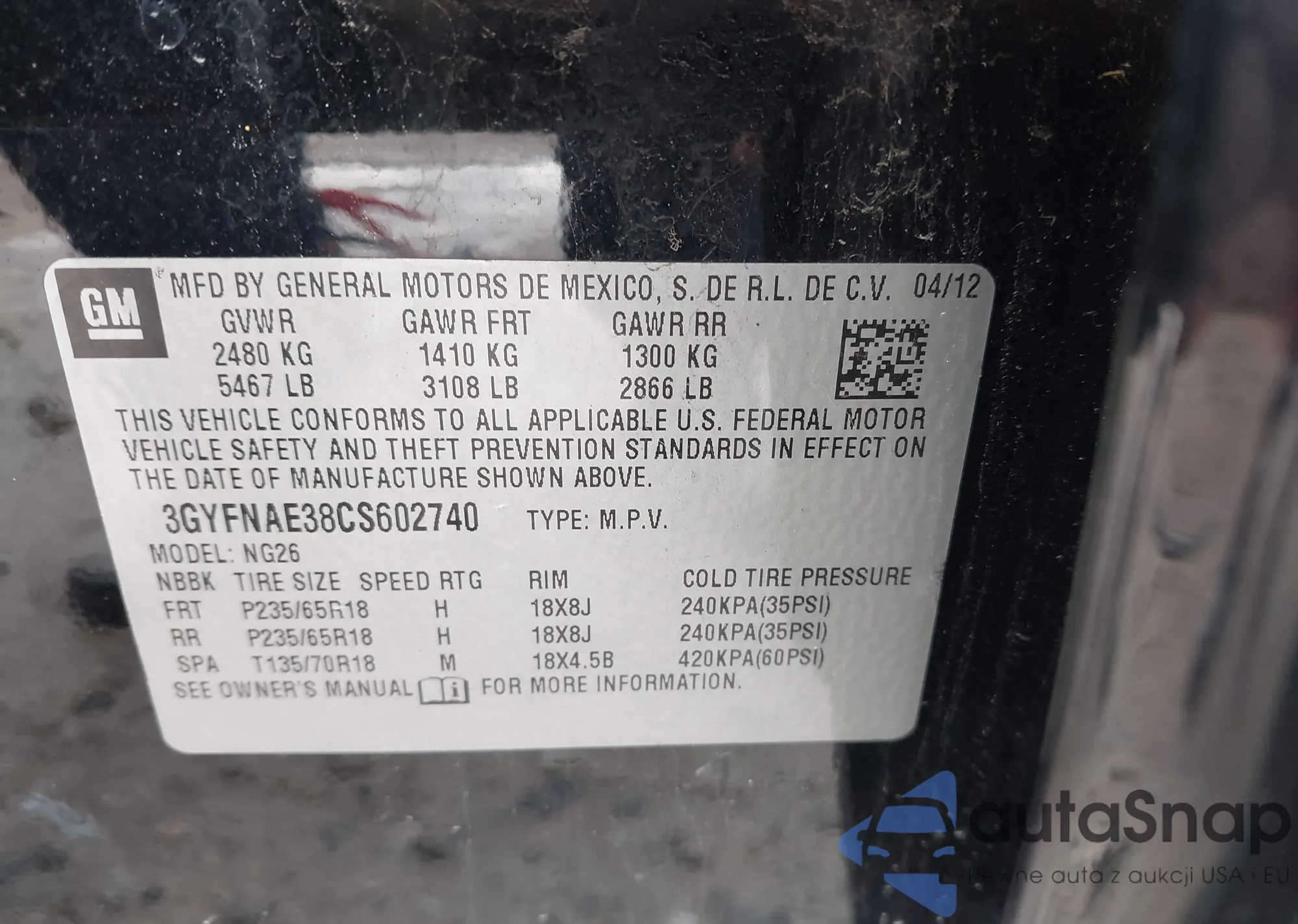 LOT: 42173629 VIN: 3GYFNAE38CS602740