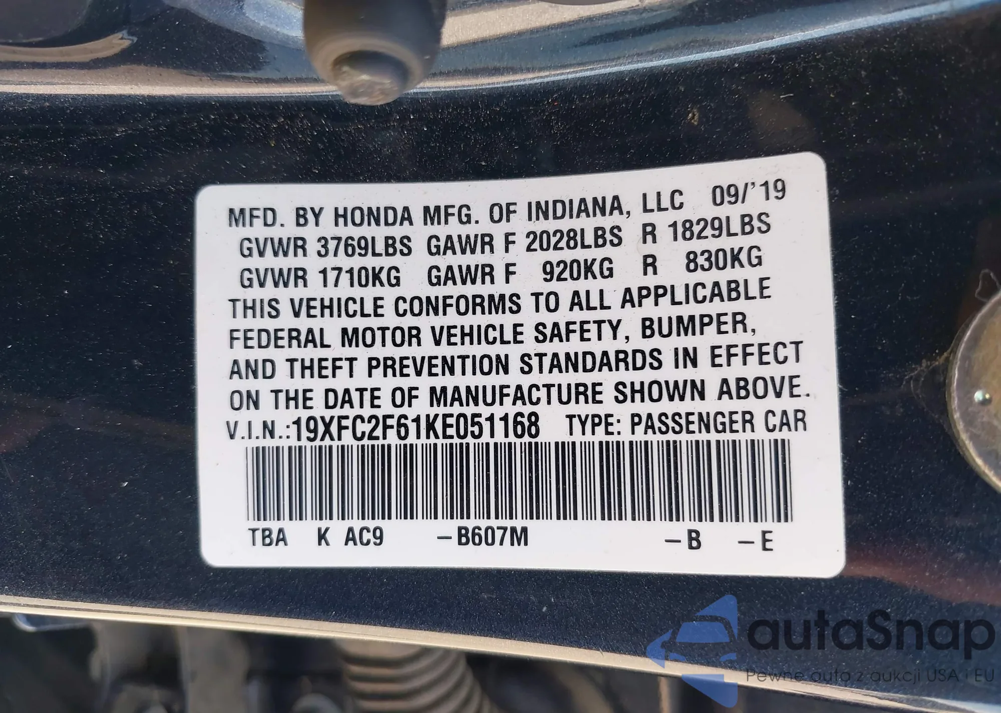 LOT: 42807408 VIN: 19XFC2F61KE051168