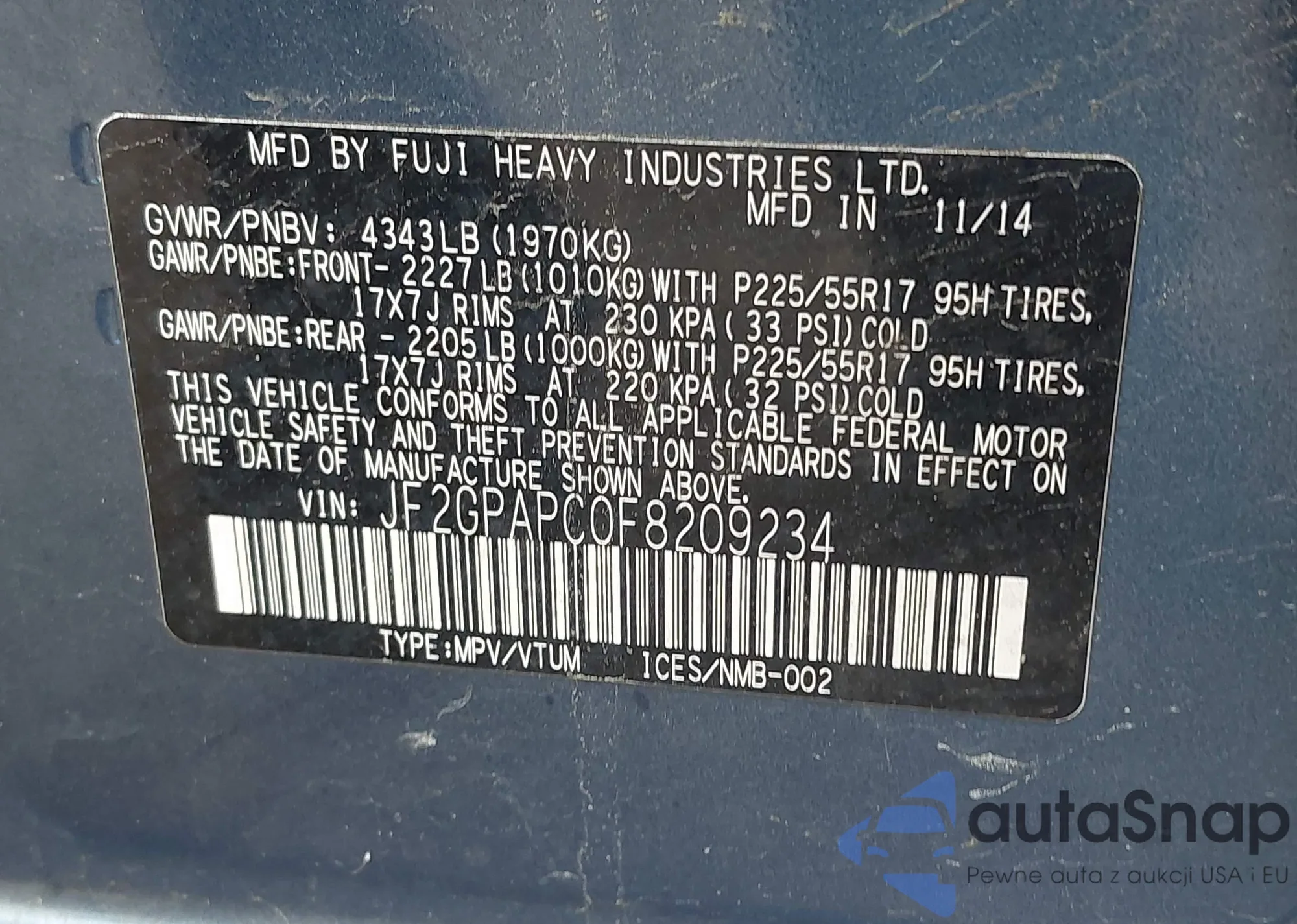 LOT: 42702416 VIN: JF2SHADC5DH442308