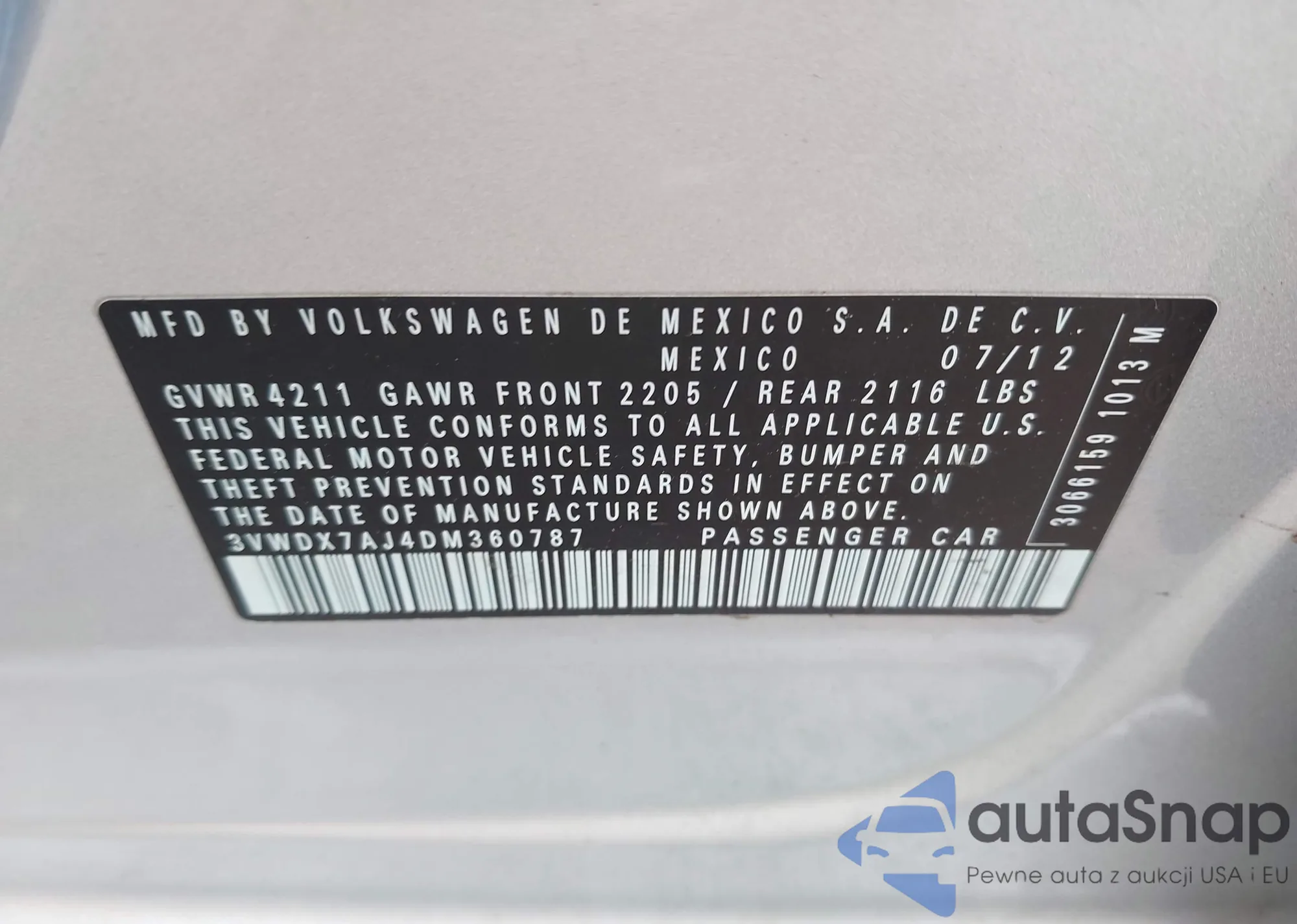 • VIN 3VWDX7AJ4DM360787