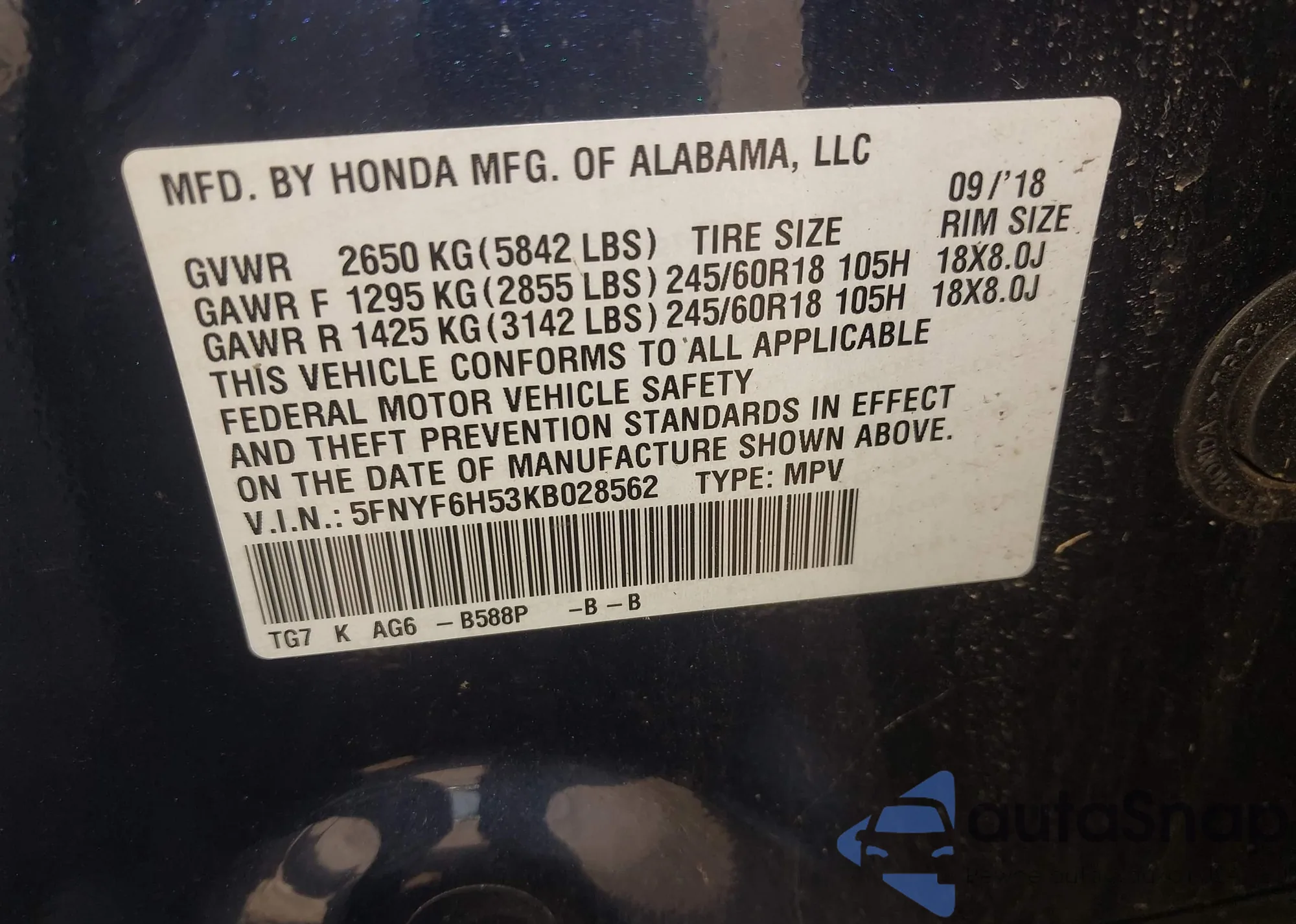 • VIN 5FNYF6H53KB028562
