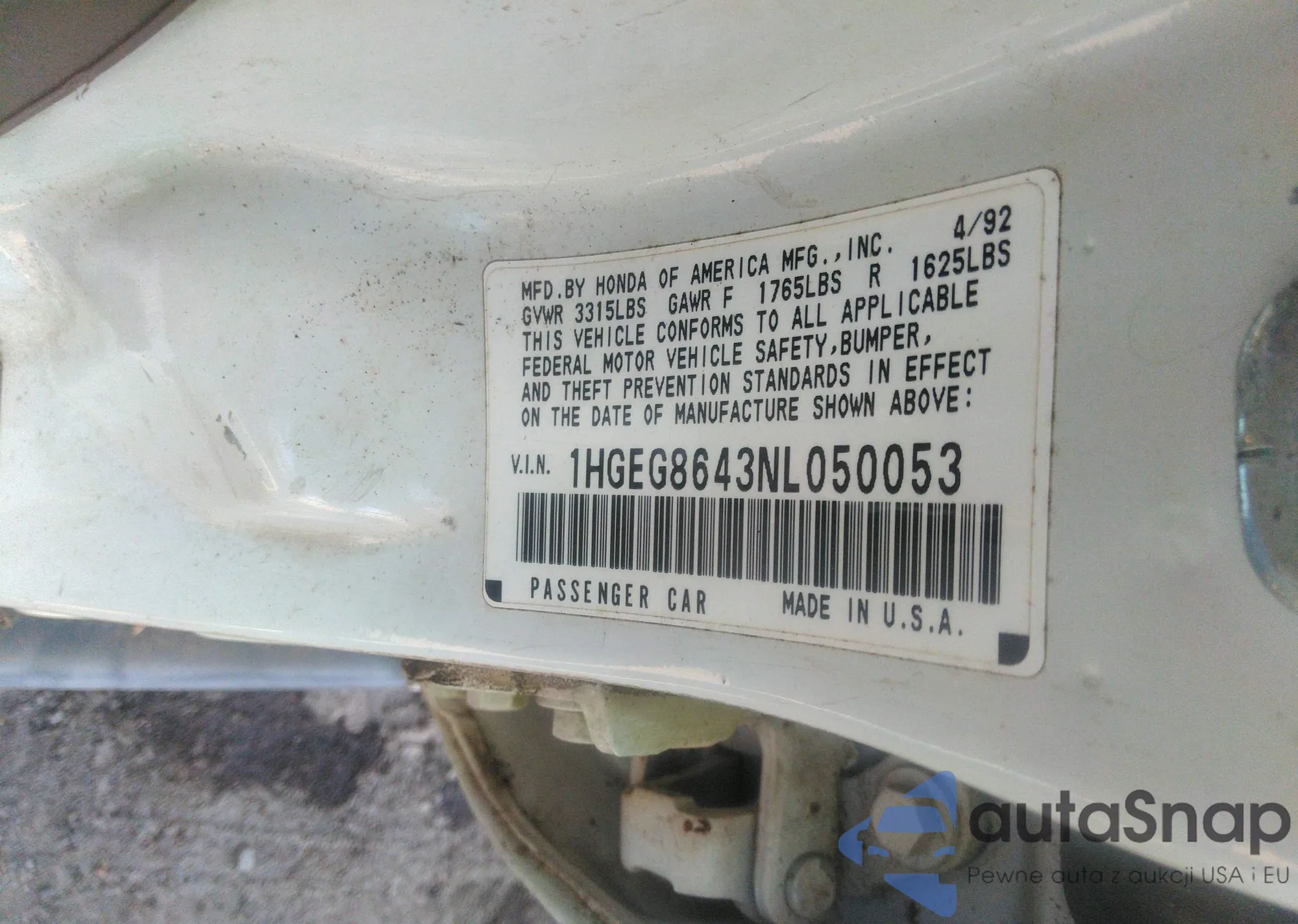LOT: 42868572 VIN: 1HGEG8643NL050053