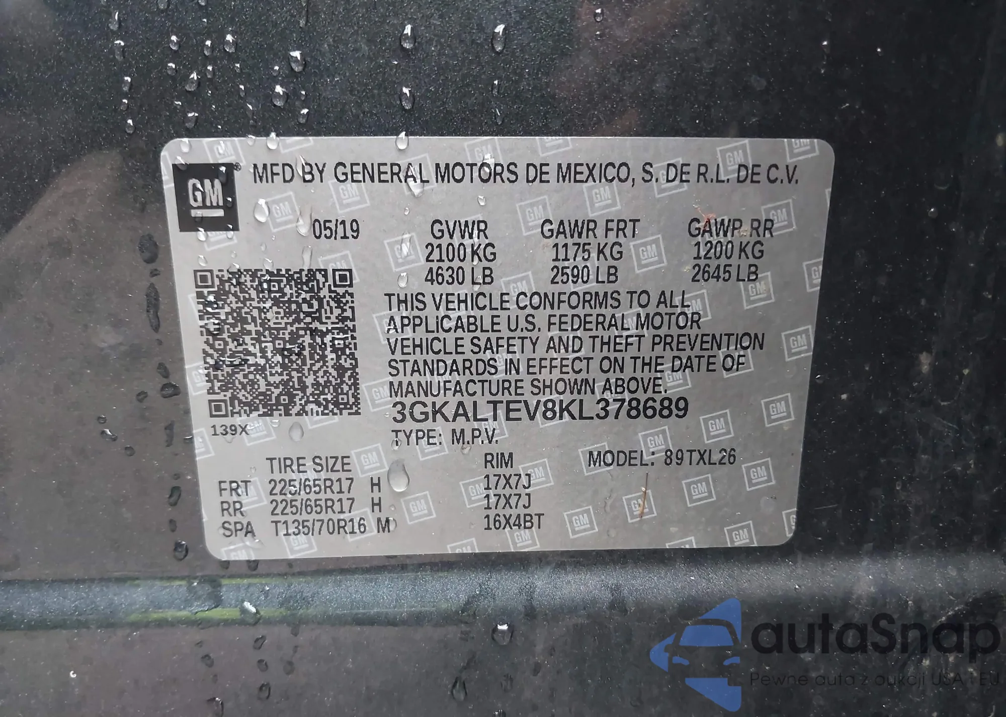 LOT: 42519567 VIN: 3GKALTEV8KL378689