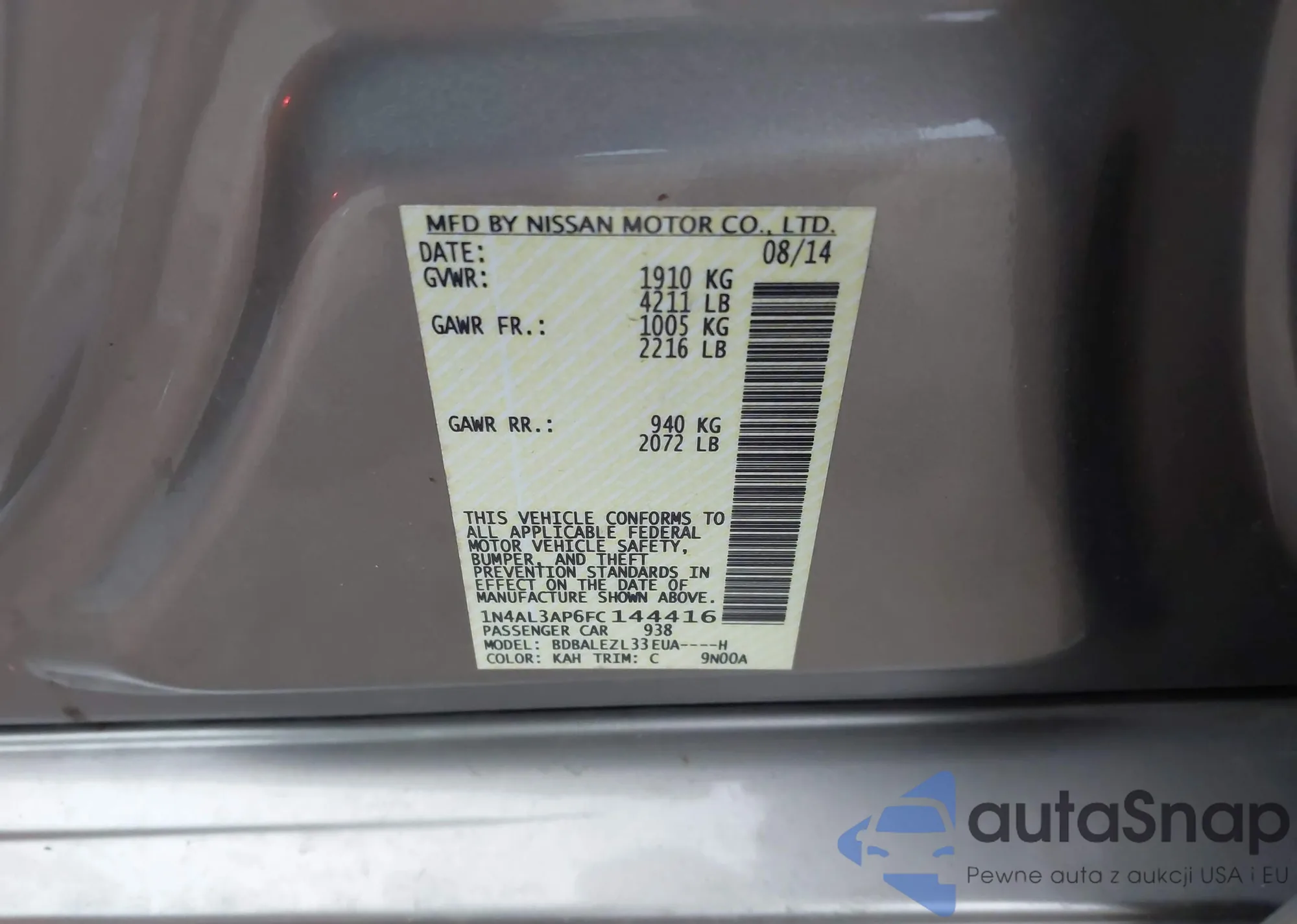 • VIN 1N4AL3AP6FC144416