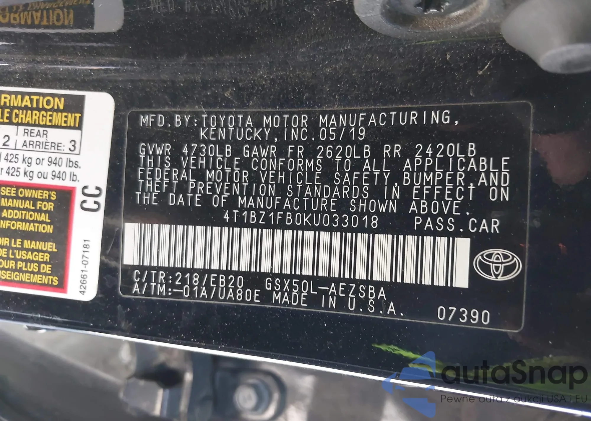 • VIN 4T1BZ1FB0KU033018