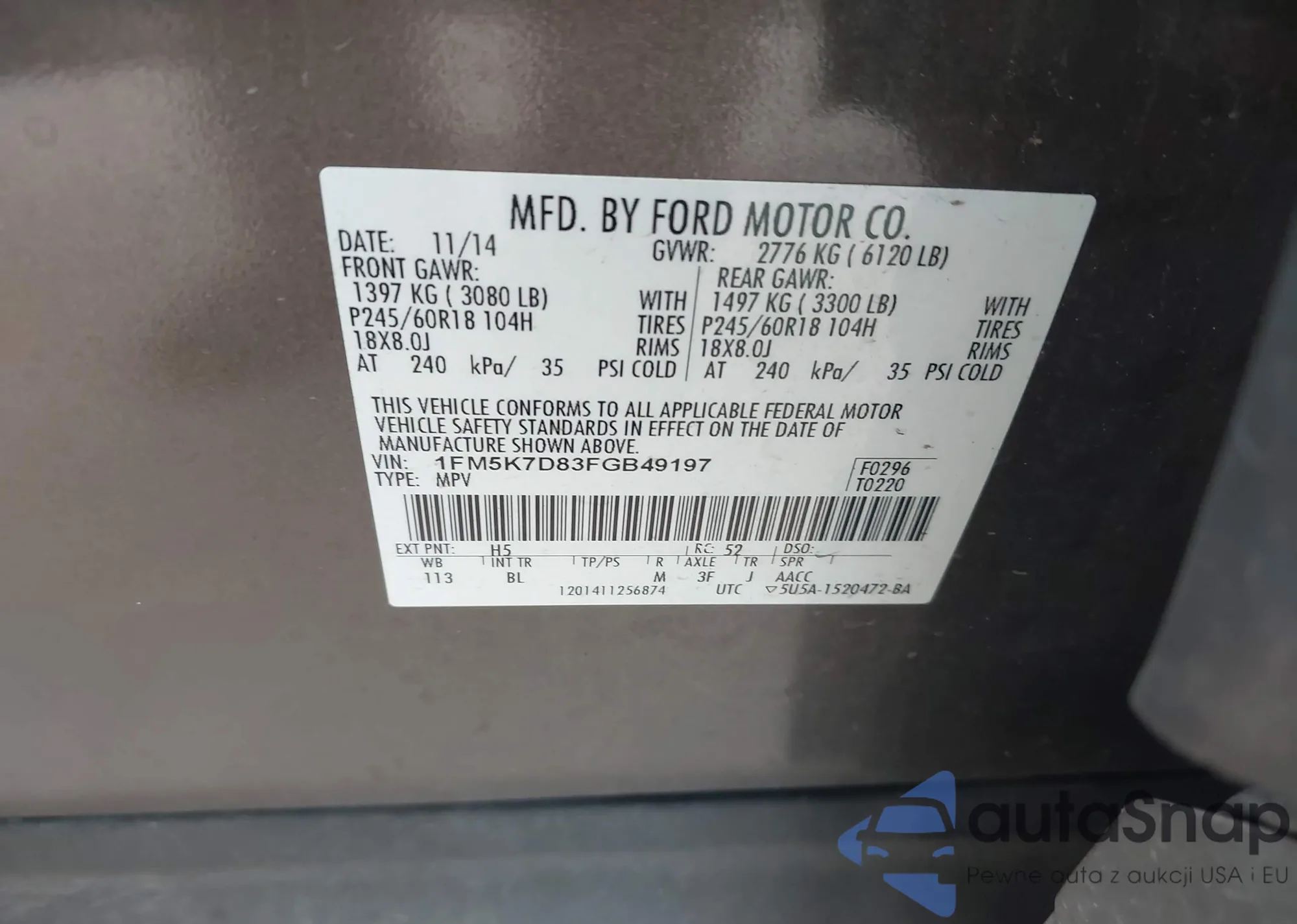 LOT: 42887763 VIN: 1FM5K7D83FGB49197