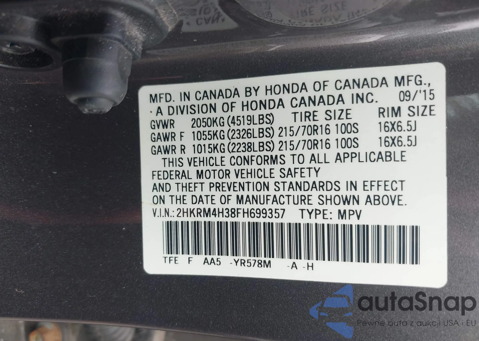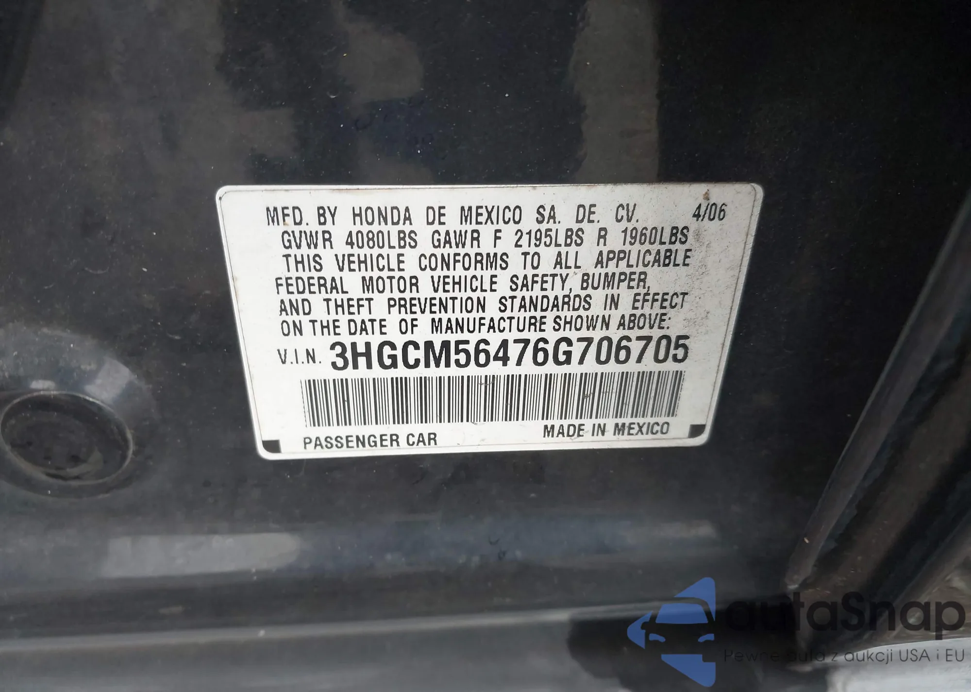 LOT: 42343943 VIN: 3HGCM56476G706705