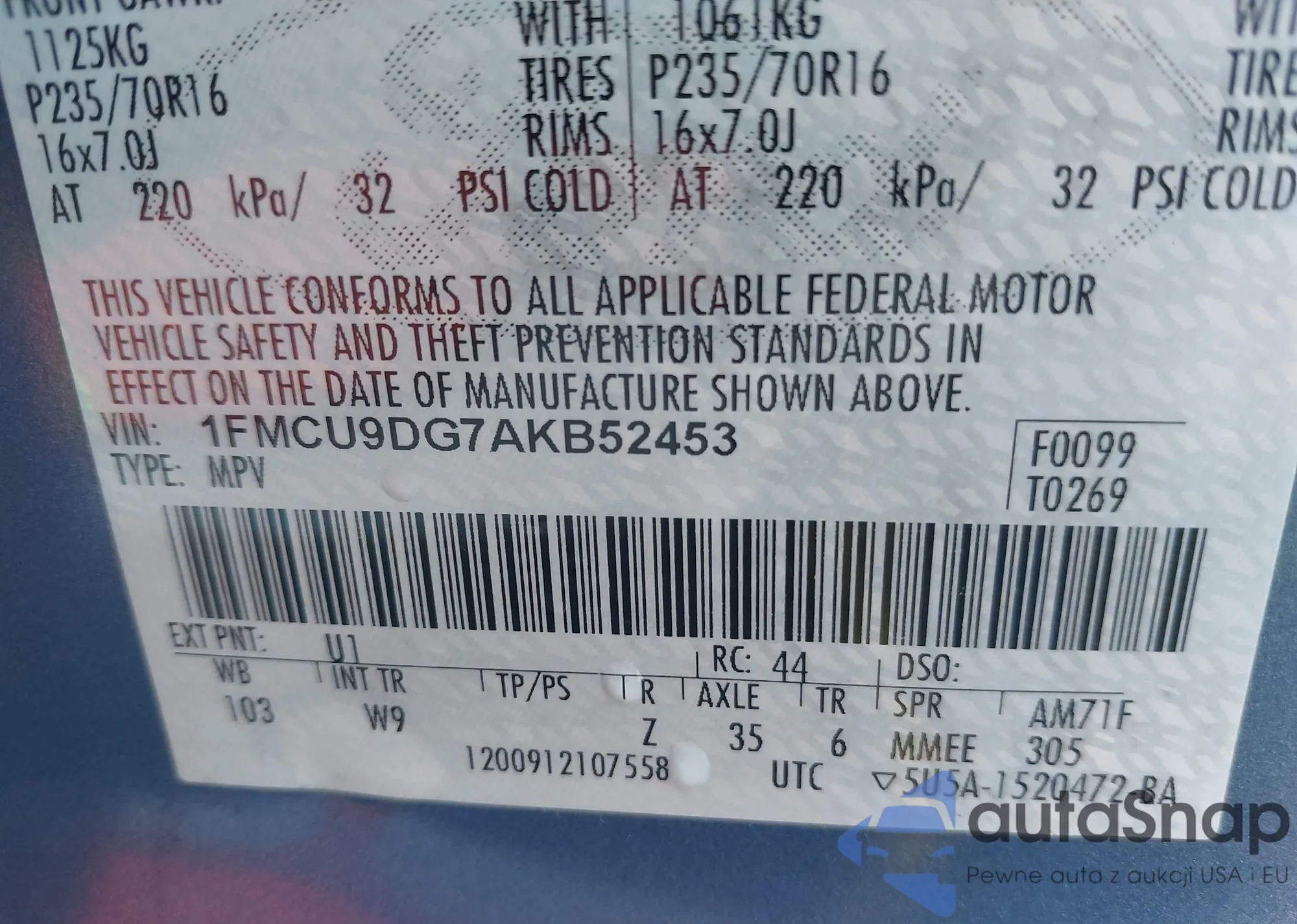 • VIN 1FMCU9DG7AKB52453