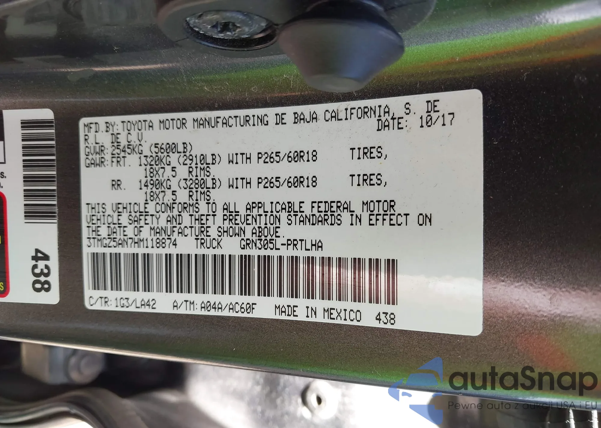 • VIN 3TMGZ5AN7HM118874