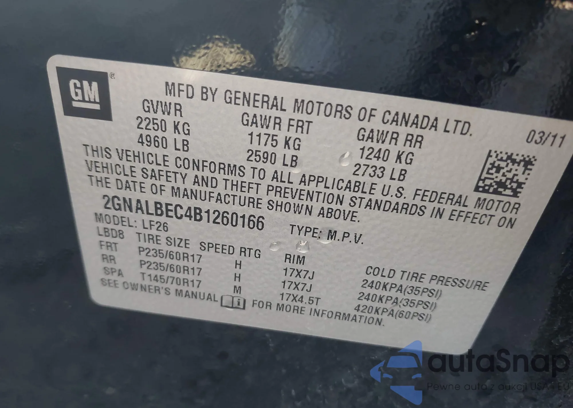 LOT: 42008296 VIN: 2GNALBEC4B1260166