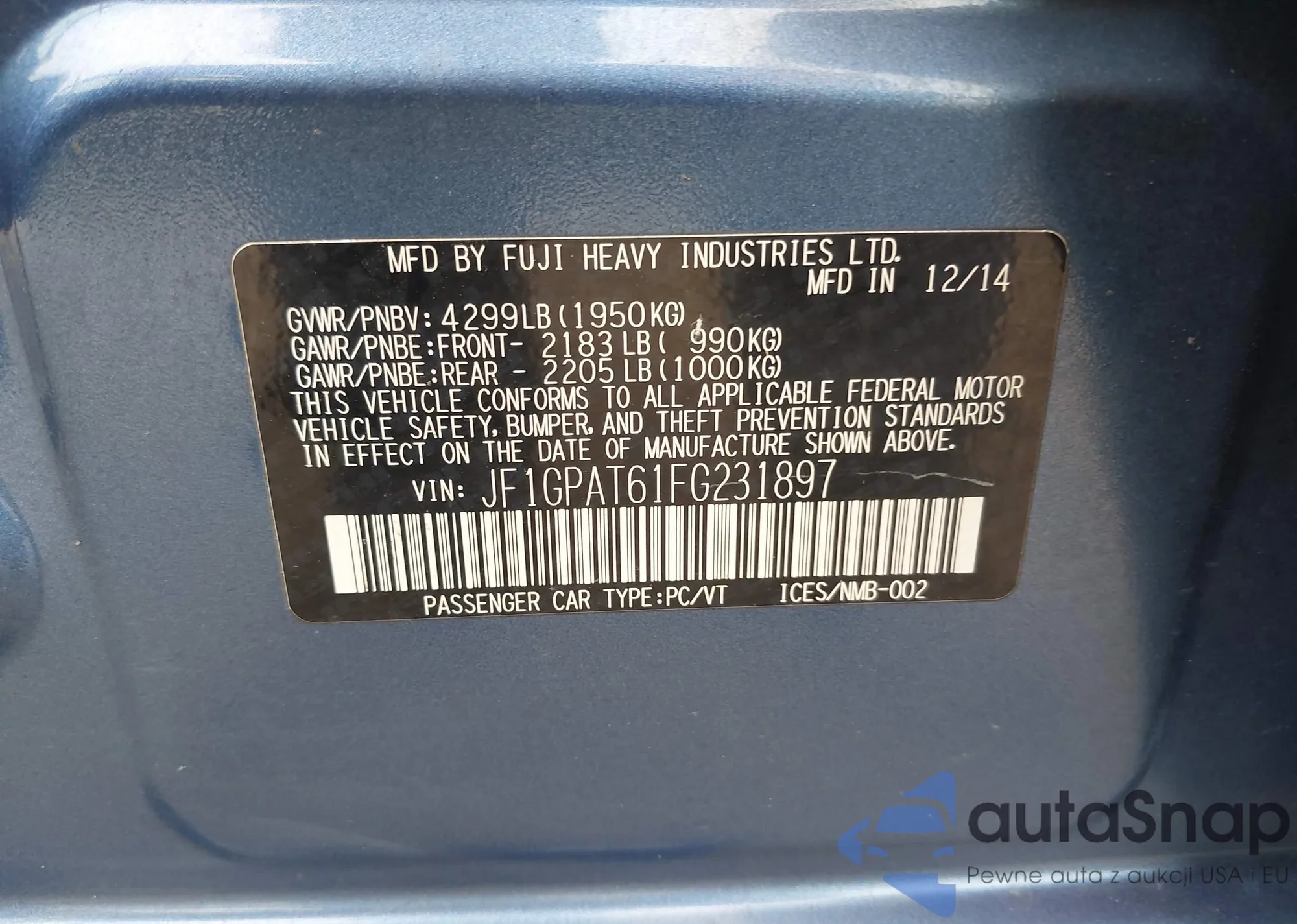 LOT: 42910352 VIN: JF1GPAT61FG231897