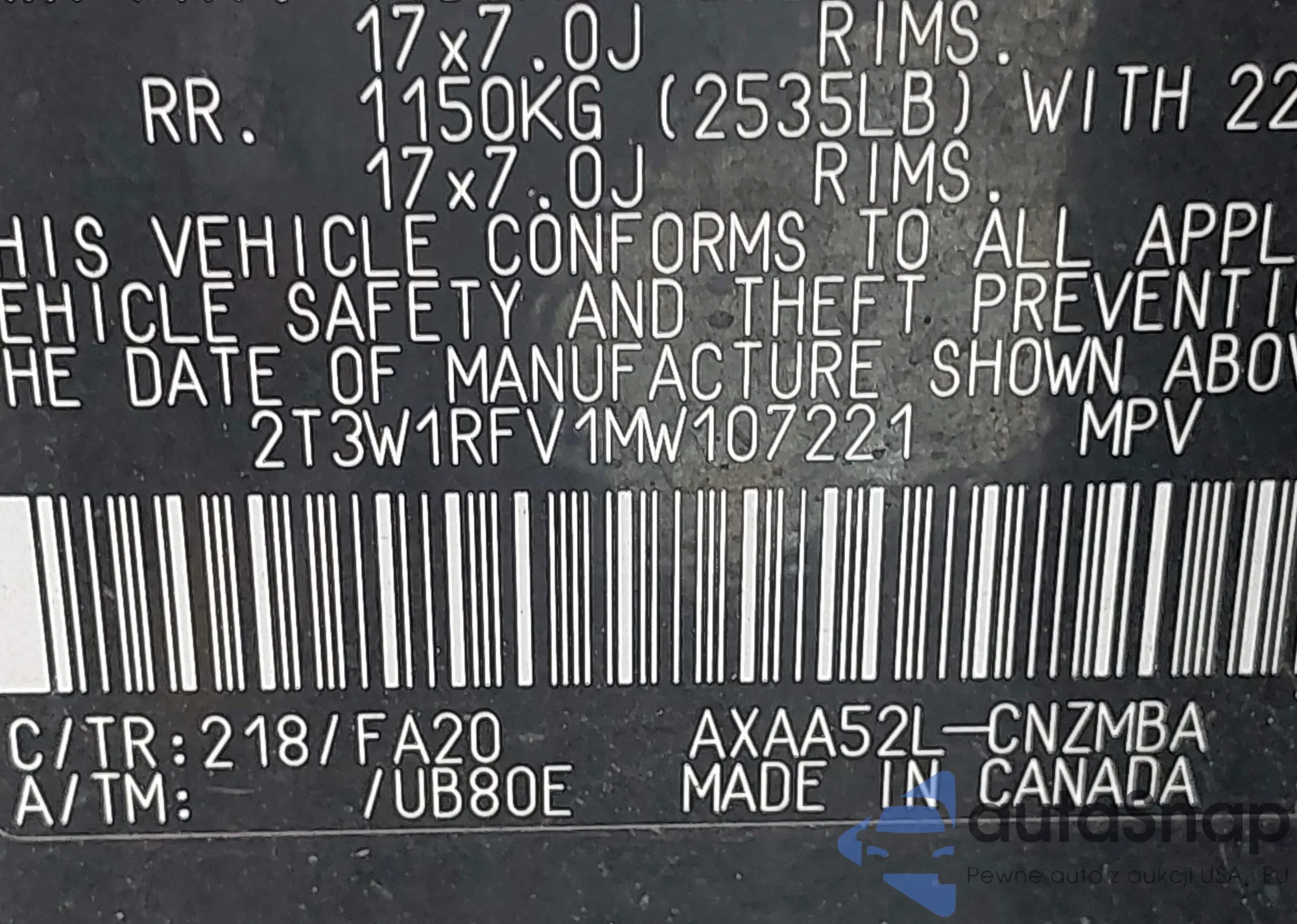 LOT: 42488920 VIN: 2T3W1RFV1MW107221