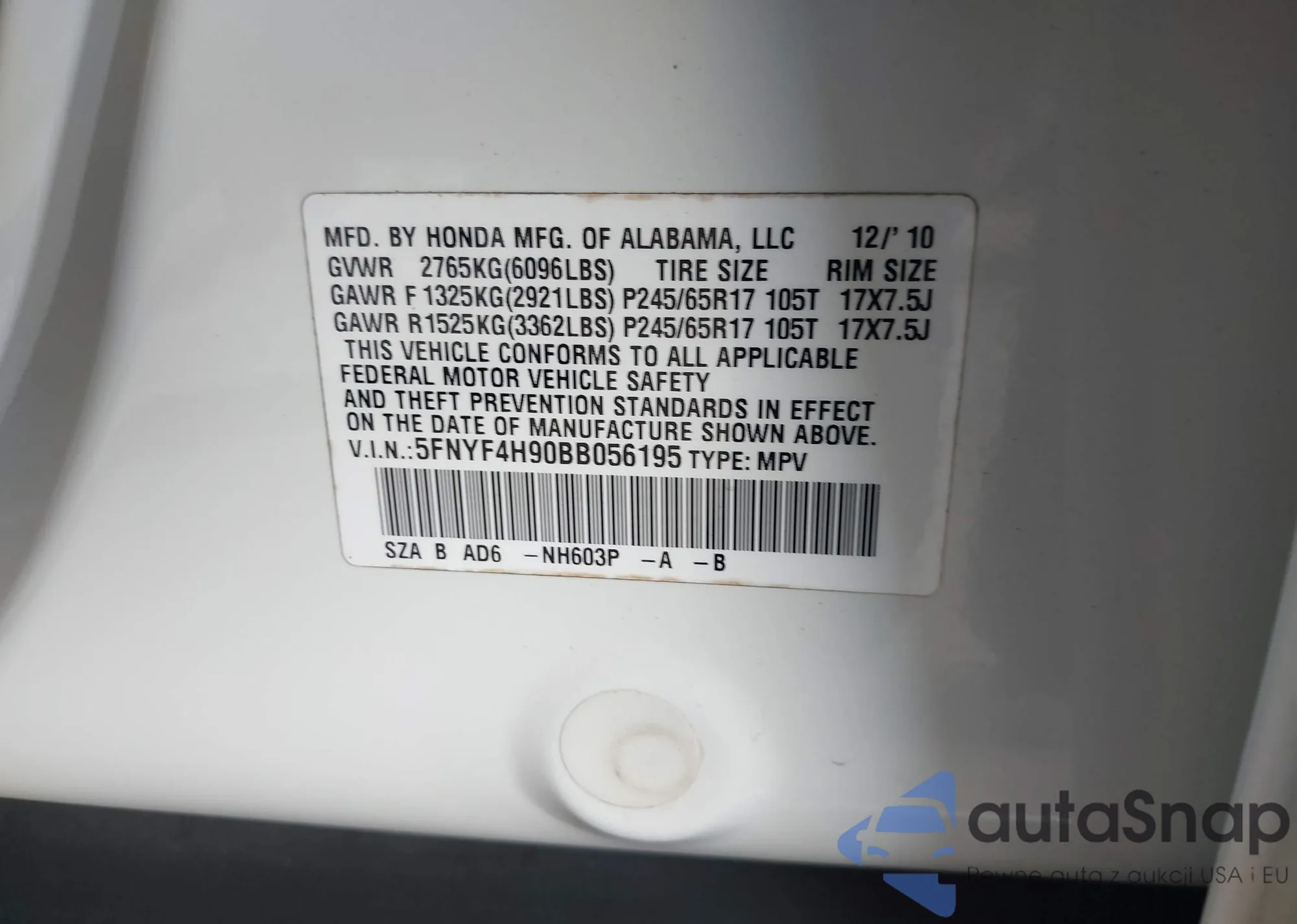 • VIN 5FNYF4H90BB056195