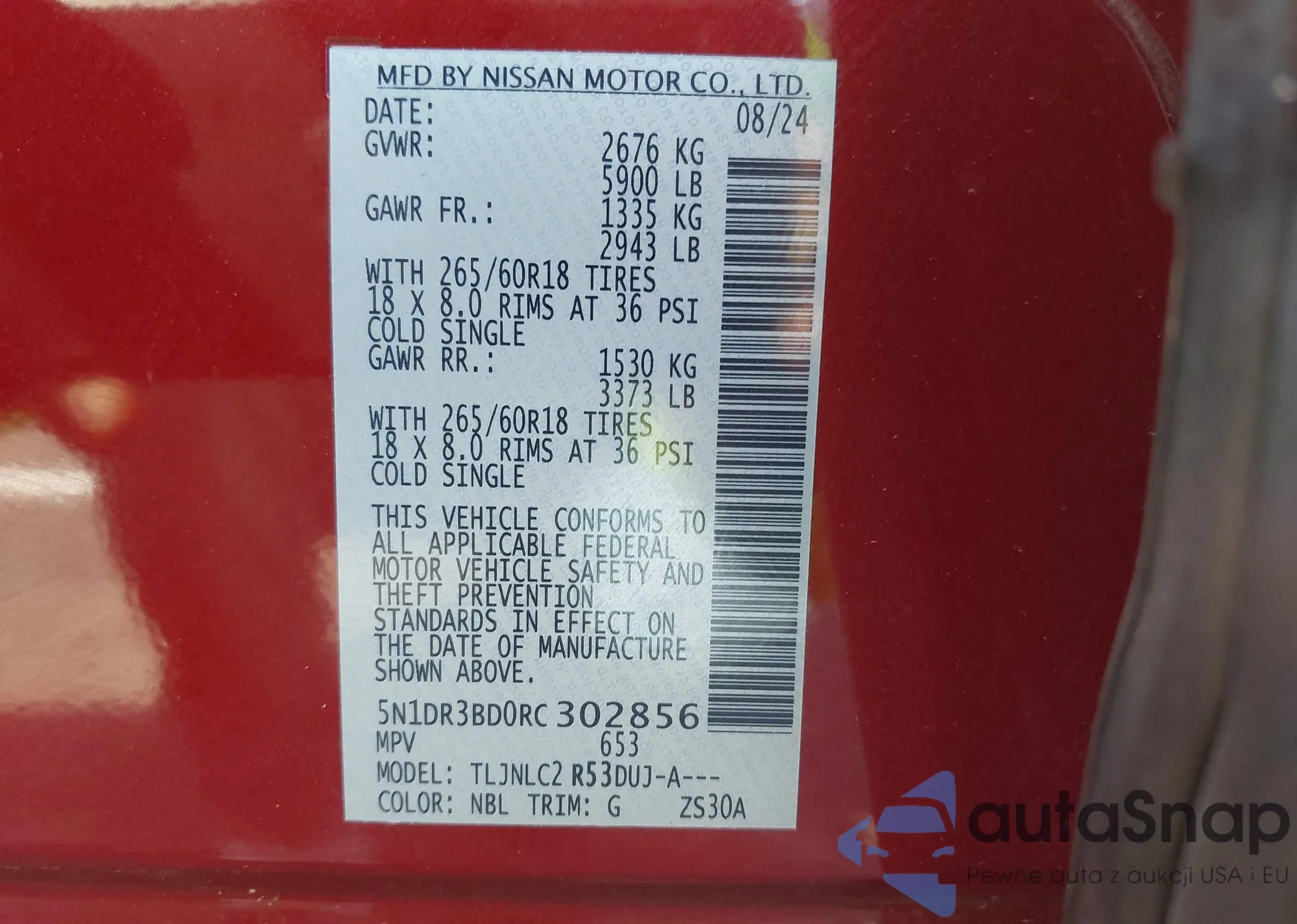 LOT: 42732285 VIN: 1N4AZ1CP1JC314481