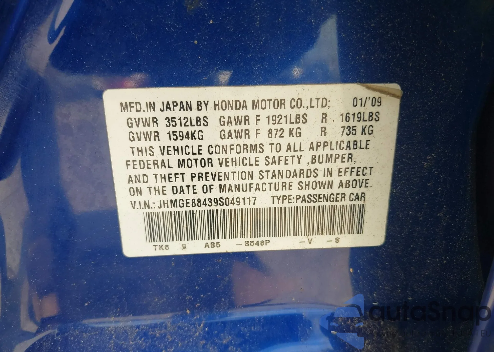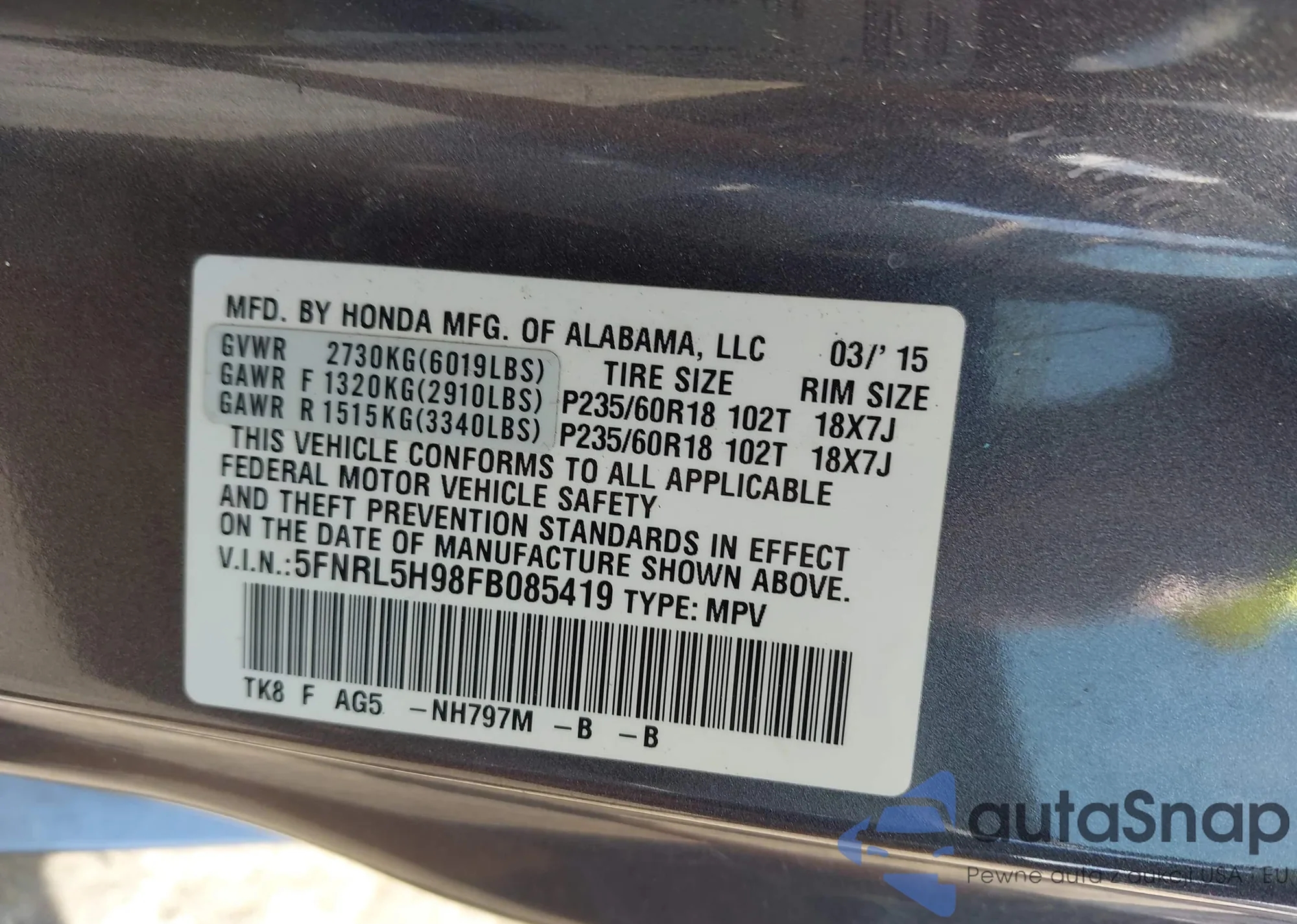 • VIN 5FNRL5H98FB085419