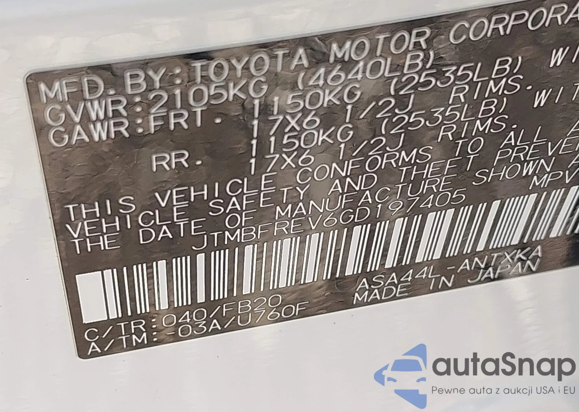 LOT: 42835969 VIN: JTMBFREV6GD197405